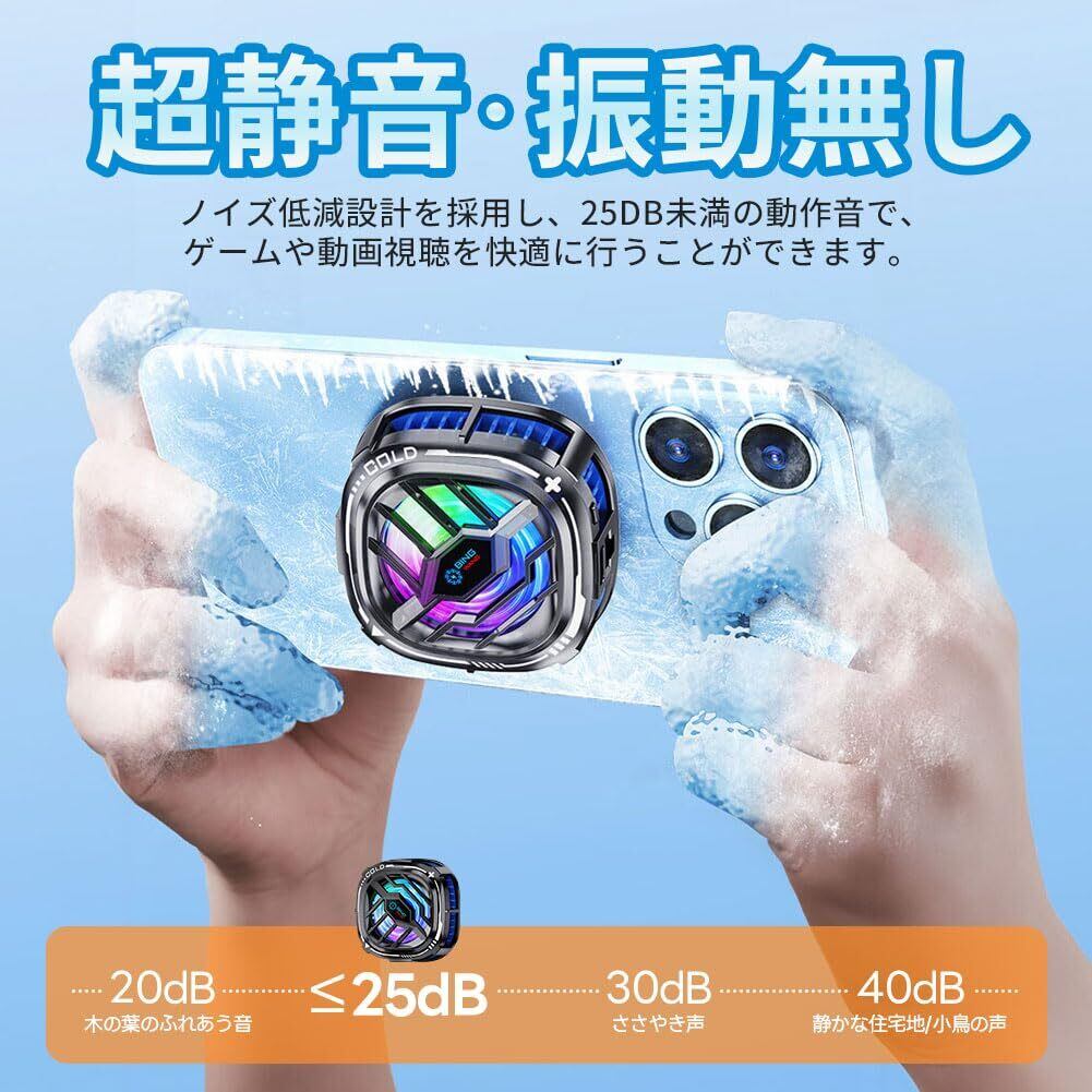 【小型&静音設計】サイズは 62x62x25mm、重さは約65gです。小型軽量で、長時間ゲームを楽しんでも手が疲れにくいです。静音モーターにより、騒音値はわずか25dBほど、耳を澄まさいと聞こえないくらい極限までファンの音を抑えた設計です。静かに効率的に冷却可能、ゲームや動画視聴なども存分に楽しむことができます。