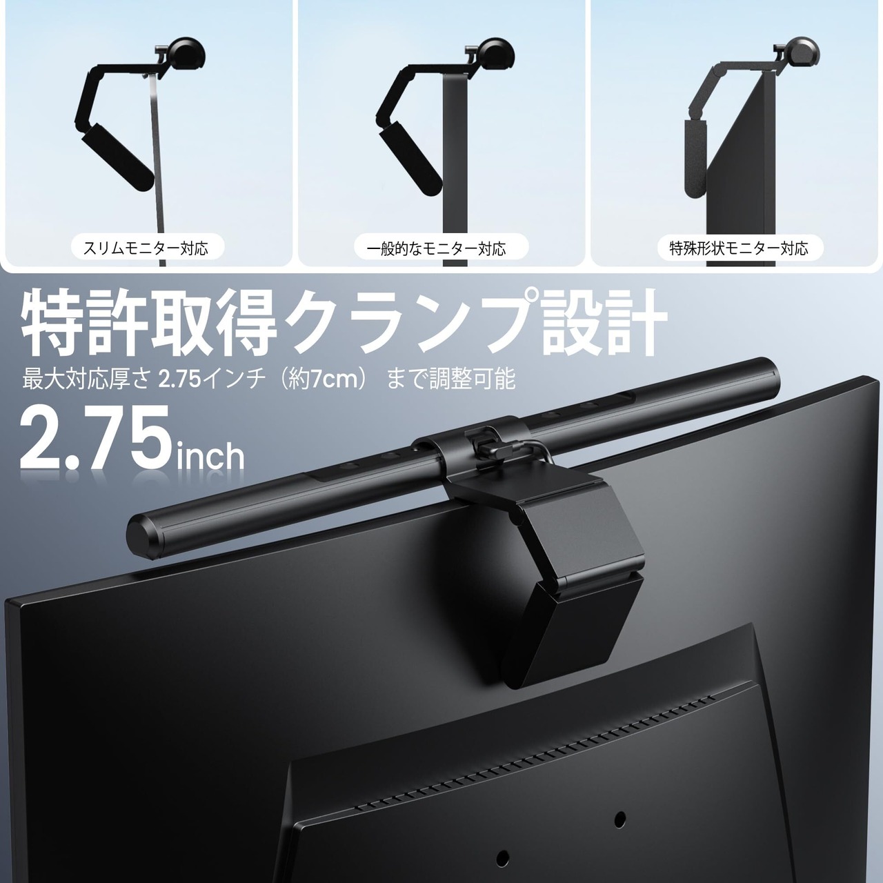 【モニター反射ゼロの光学設計で作業に集中】 特殊な非対称配光技術を採用しており、モニターの画面への反射を完全に防止します。これにより、画面の視認性が向上します。モニターの上部に簡単に取り付けることができ、デスク全体を均等に照らしながら、画面の明るさを均一に保ちます。長時間の作業やゲームにも最適で、集中力を高める明るさを提供します。