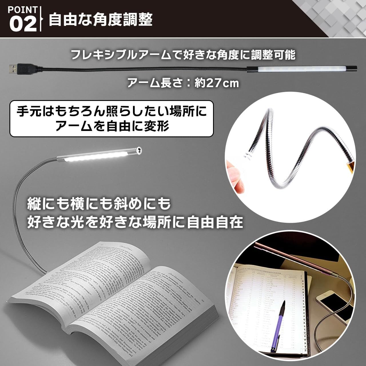USB端子からLEDライトまでのアームは自由に曲げることができるため、ご自分の好きな形でLEDライトをセットできます。縦にも横にも使える自由自在のデスクライトです。