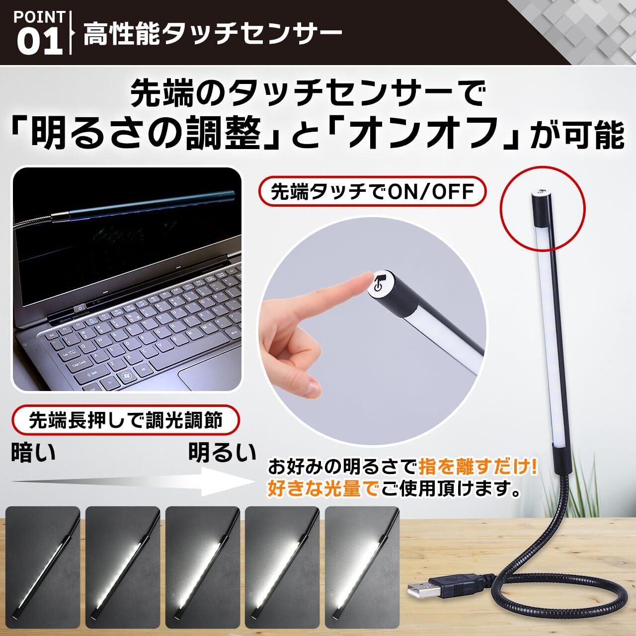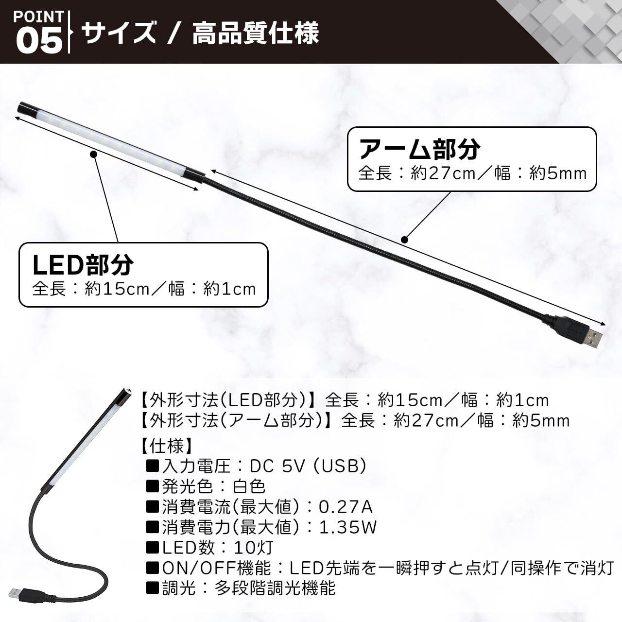 【仕様】入力電圧:DC 5V (USB)/発光色:白色/消費電流(最大値):0.27A/消費電力(最大値):1.35W/LED数:10灯/ON/OFF機能:LED先端を一瞬押すと点灯/同操作で消灯/調光:多段階調光機能
