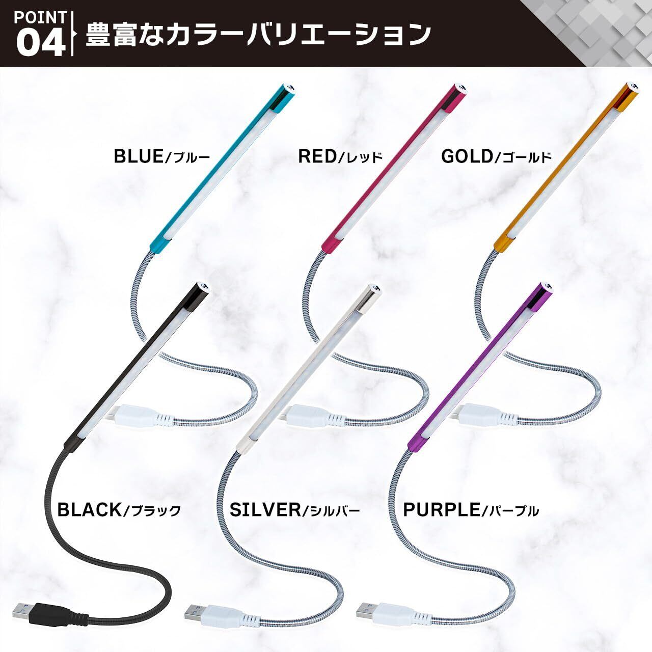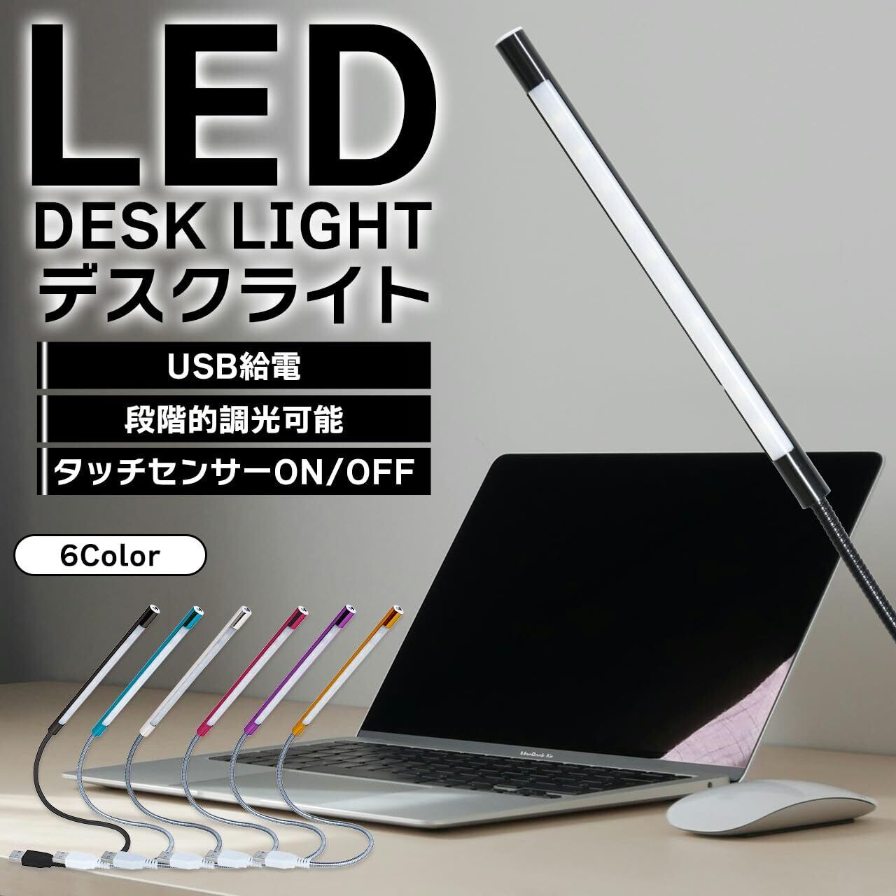 フレキシブルアーム付きのLEDデスクライトです。ノートパソコンやモバイルバッテリーなどのUSB端子に差してお使いください。