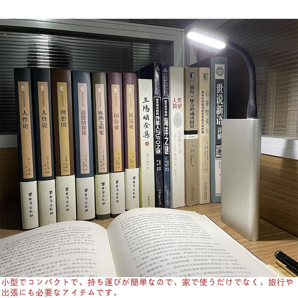 このUSBライトは、自在に角度を調整できるため、自分好みのポジションで照明を当てることができます。読書や仕事中の作業環境を最適化するため、大変便利なアイテムです。明るさも必要に応じて調整でき、集中力を高めます。