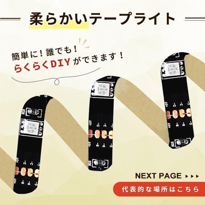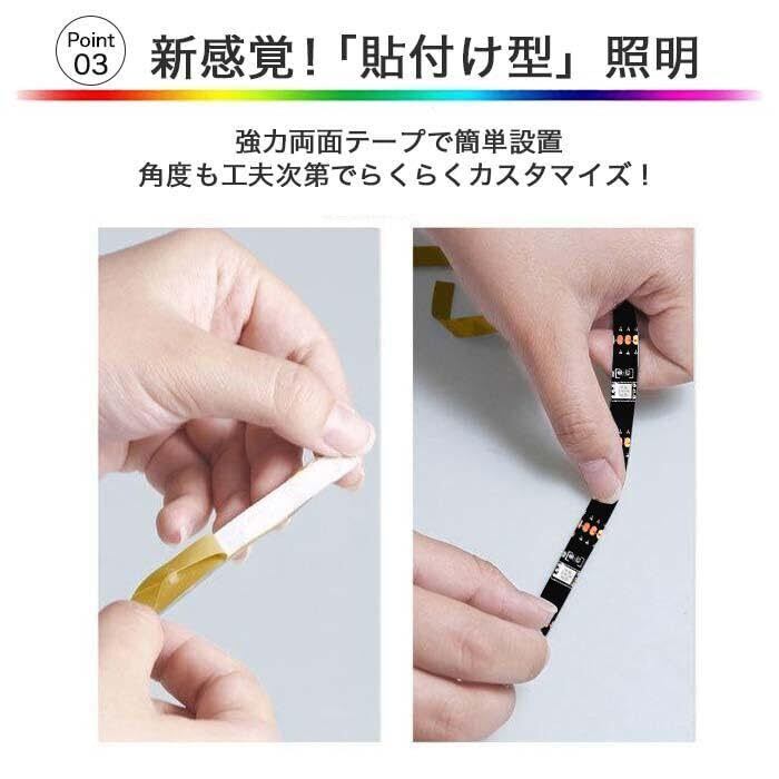 USB給電式なので、パソコンやモバイルバッテリーから手軽に電源を供給できます。細長いテープ式で曲げることができ、両面テープが付いているため、どんな場所でも簡単に取り付け可能です。また、必要に応じてカットすることもでき、自分のスペースに合わせた長さに調整できます。