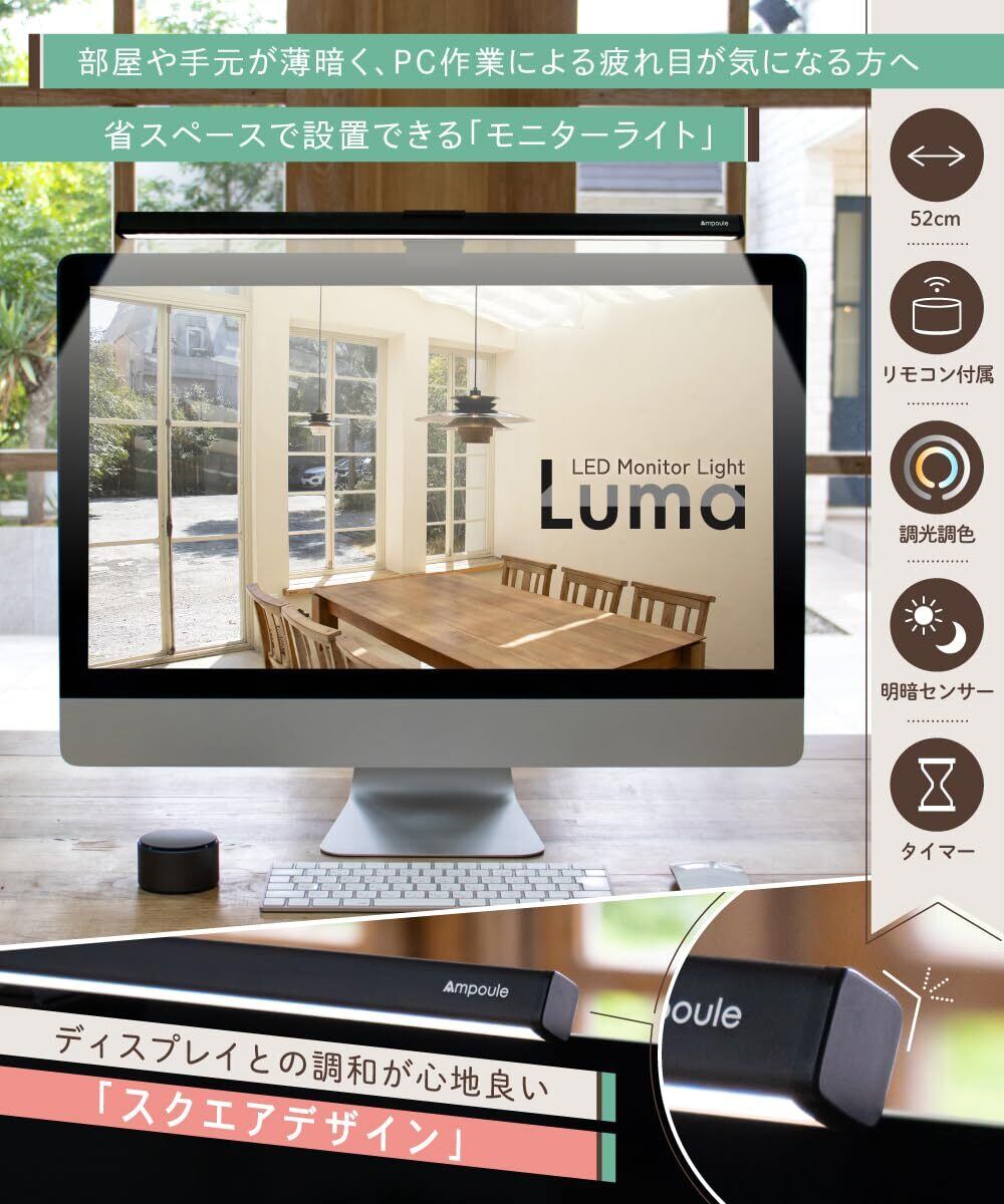 Ampoule 【目の負担を軽減・明暗センサー】 モニターライト 52cm リモコン 1250Lux スクエアデザイン 自動調光 無段階の調光調色 高演色性 USB 曲面モニター対応 デスクライト Luma ルマ