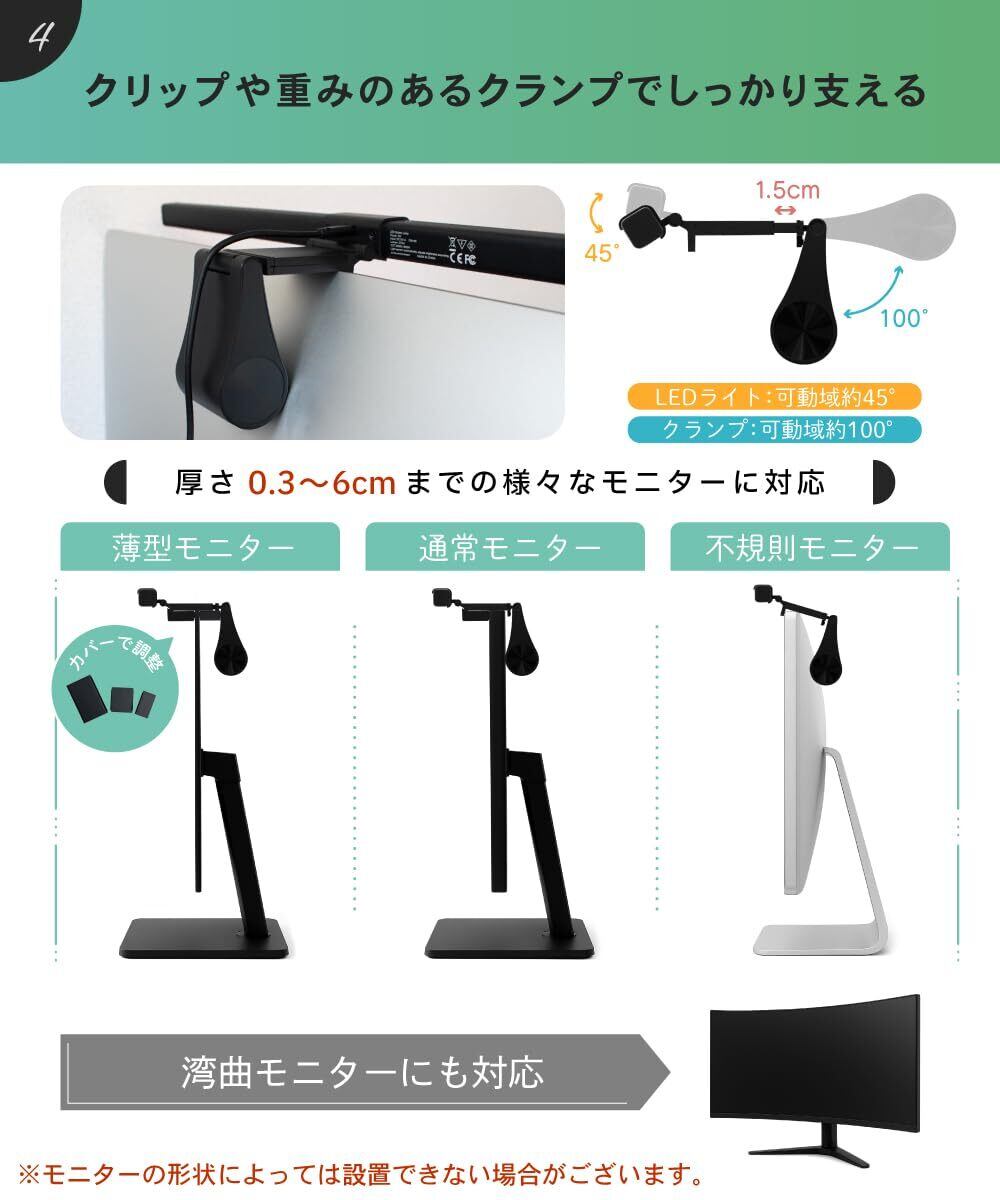 『22インチ以上のモニターに使いやすい52cm』余計な場所まで照らさない。ライトの横幅より短すぎず長すぎない22-27インチ前後、厚さ0.3〜6cmまでの様々なモニターに対応しています。