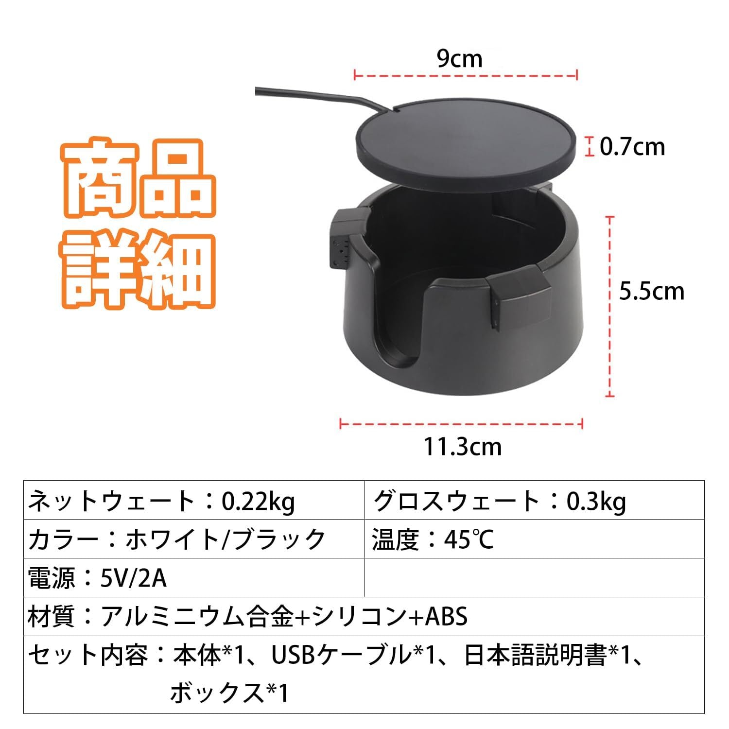 本体サイズ:11.3*11.3*5.5cm ネットウェート:0.22kg グロスウェート:0.3kg 材質:アルミニウム合金+シリコン+ABS カラー:ホワイト/ブラック セット内容:本体*1、USBケーブル*1、日本語説明書*1、ボックス*1