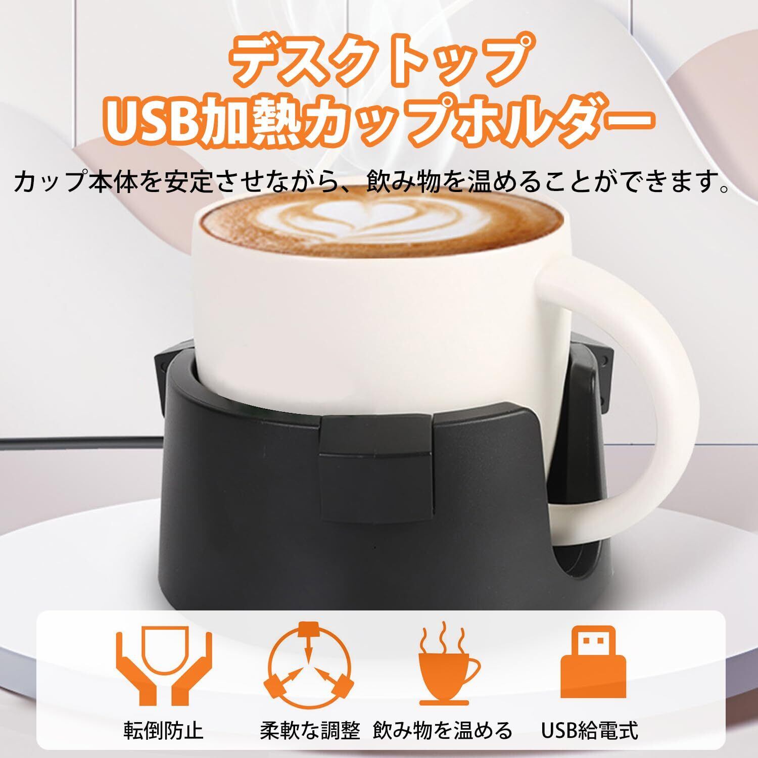 USB保温コースター:飲み物を温かい状態で飲みましょう。45℃のちょうどよい温度を保持します。コーヒー、ミルク、スープ、ココア、紅茶(ホットティー)などお好きなお飲み物でお使いいただけます。朝晩の冷える時間帯でも常に最適温度を保ちます