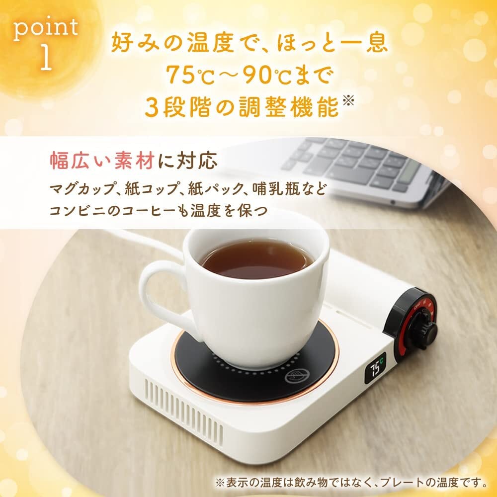 【3段階の温度調整】:弱(約75℃)中(約80℃)強(90℃)の3段階に調整することが可能です。オフィスや食卓、寝室でちょうど良い熱さのままほっと一息入れられます。*表示の数値は飲み物ではなくプレートの温度です