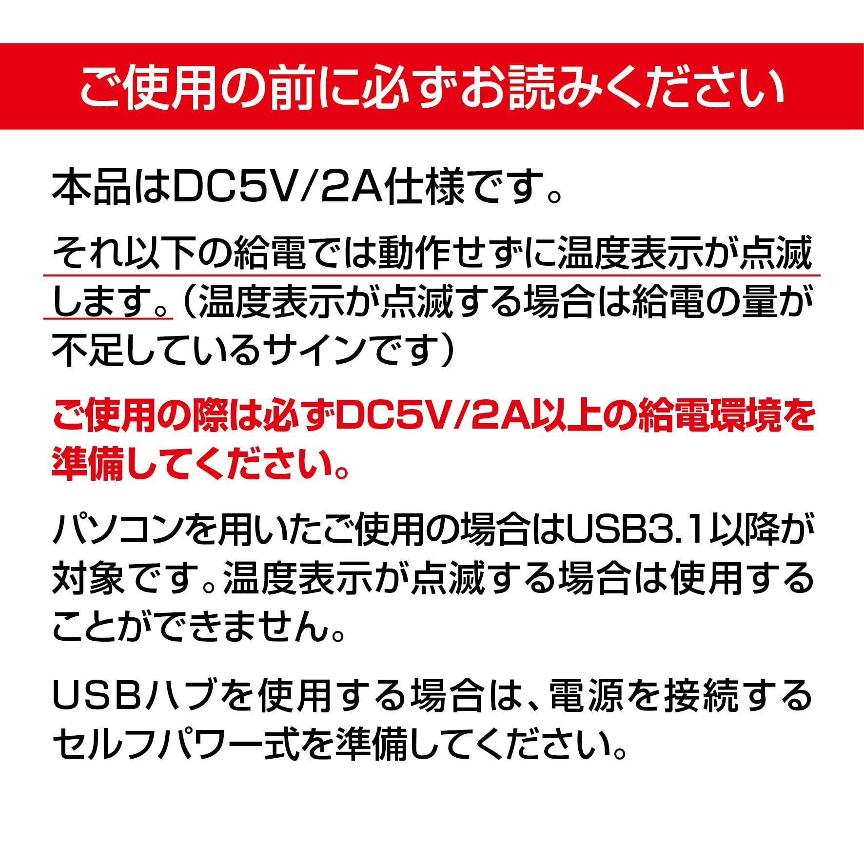 【温度欄が88と設定温度で点滅表示された場合は初期不良ではなくPCのUSB側の供給電力不足です】工場で全数検査している商品です。消費電力2A:10W/3A:15W、定格入力:DC5V 2A、USBタイプA。MacはUSB-Cなので変換コネクタをご使用ください。WindowsPCでご使用の場合はUSB3.1以降対応。供給電力が弱いUSB2.0(0.5A)または3.0(0.9A)のみのWindowsPCで電力不足により使用出来ない場合はモバイルバッテリーやセルフパワーUSBハブ等でご使用ください。