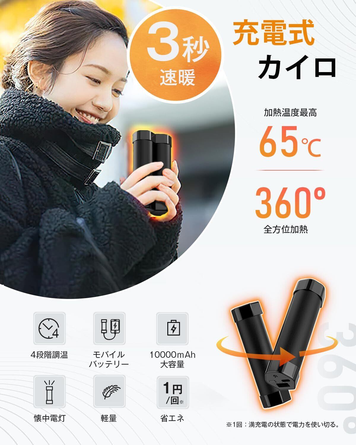 充電式カイロ 360°全面発熱 速熱 4階段調温 最大14時間連続発熱 モバイルバッテリー機能 10000mAh 大容量 懐中電灯機能 電気カイロ マグネット分離式 小型 軽量 おしゃれ 5V/2A急速充電 防災 ギフト プレゼント用 冬の贈り物(Black)