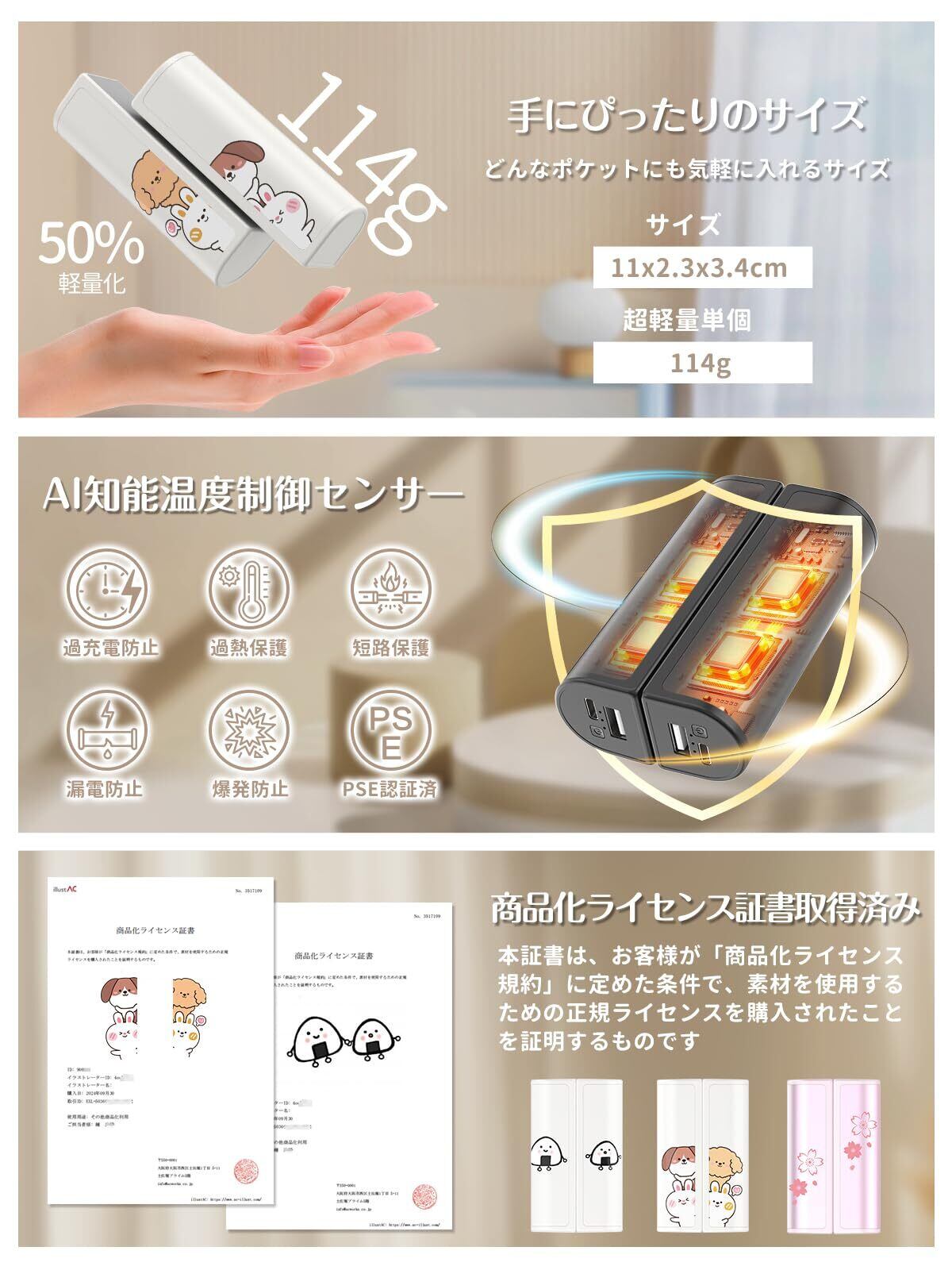 【PSE認証取得済み・安心サービス&日本語取扱説明書付】パッケージ内容:充電式カイロ本体、USB-Type-C変換アダプタ、USBコード、ストラップ、収納バッグ、日本語取扱説明書。本充電式カイロは日本国内におけて、を取得済みの製品です。は出荷する前に製品に厳格なテストを行っていました。ご購入後も期間内に製品の不具合が生じた場合、SUKITENのカスタマーサポートへお問い合わせいただければ、にて確認後、同一製品の新品と交換対応いたします。