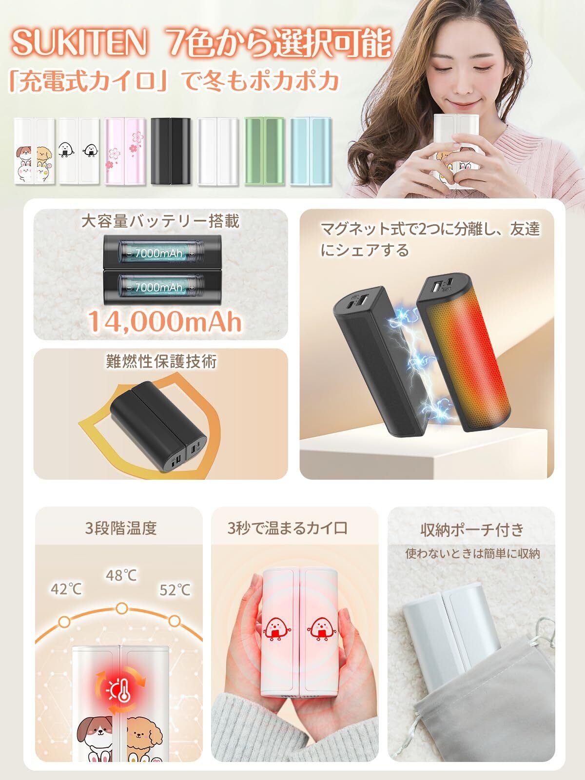 【日本限定】SUKITEN 充電式カイロ 14,000mAh大容量 3秒急速発熱 3段階温度調節 全面発熱 モバイルバッテリー機能 電気カイロ 超軽量 マグネット分離式 5V/2A急速充電 便利グッズ 持ち運びやすい PSE認証済み 寒さ対策 旅行 アウトドア 出張 通勤 プレゼント 2個セット