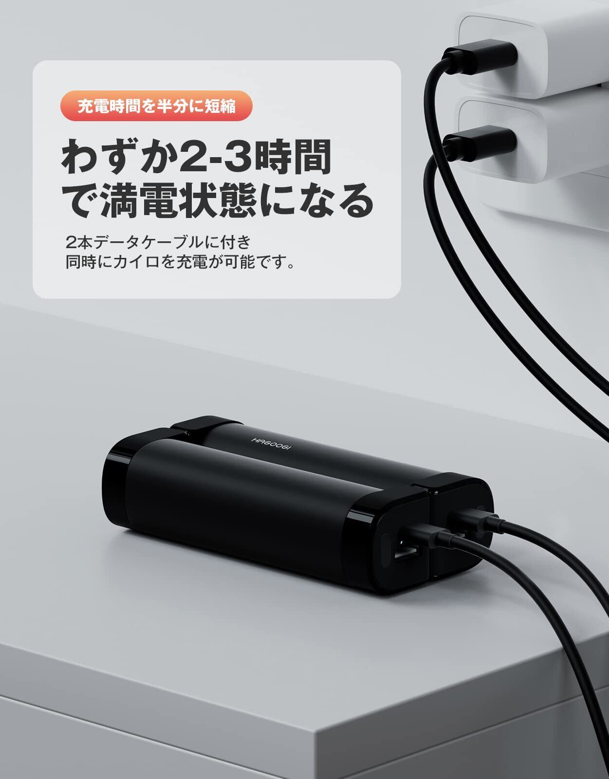 「2本充電ケーブル」また、電気かいろは2本USB-C充電ケーブル(5V・2V)付き、カイロを同時に充電するもでき、充電時間を1本しかない他社と比べて半分短縮、わずか2-3時間で二つとも満電状態になる。