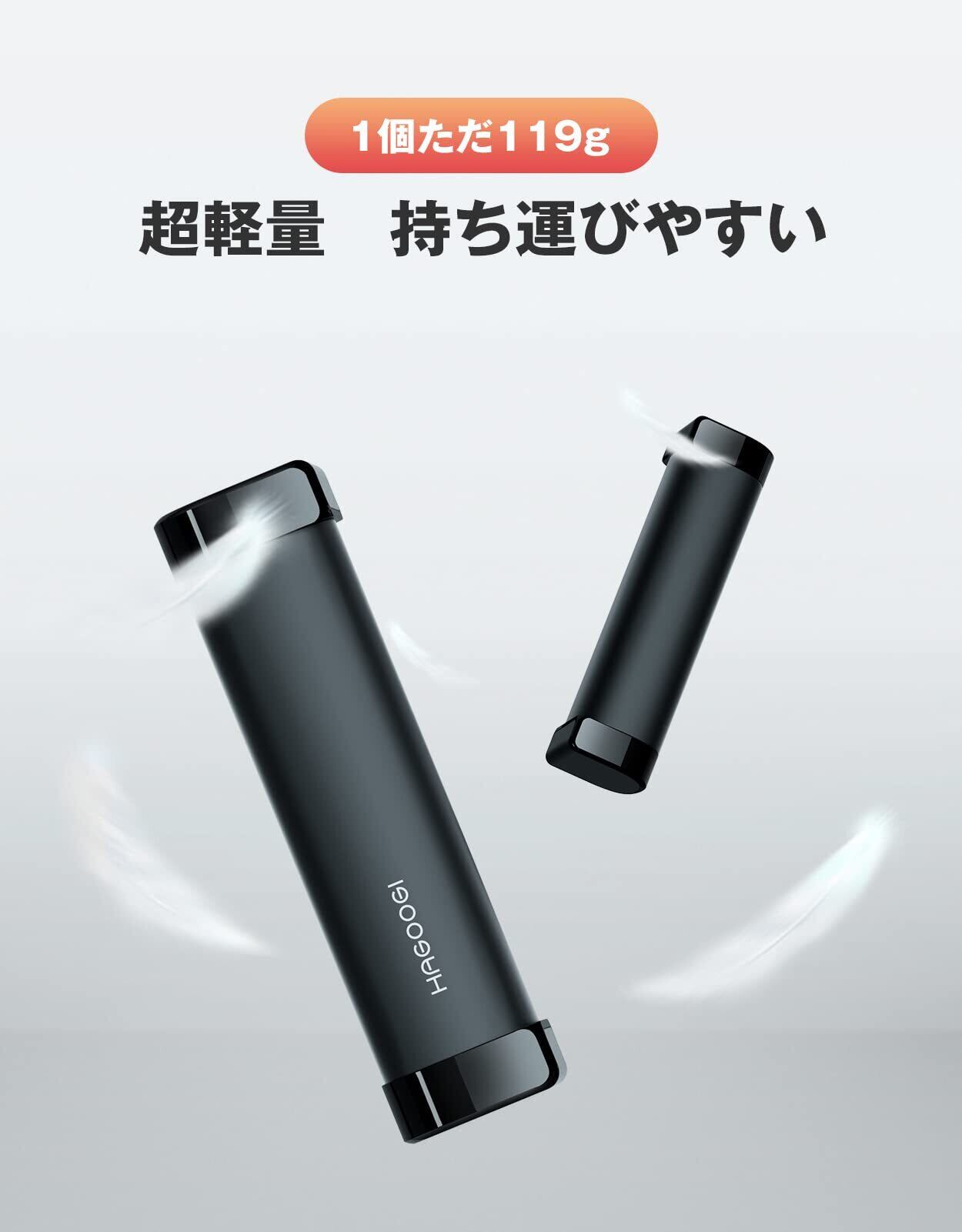 「真・軽量の小型充電式カイロ」1個の重量はわずか119gで、女性やお子様もストレスなく握りやすく、二個並べる場合の本体サイズは幅29*長さ58*高さ112mmで、収納・持ち運びやすいです。