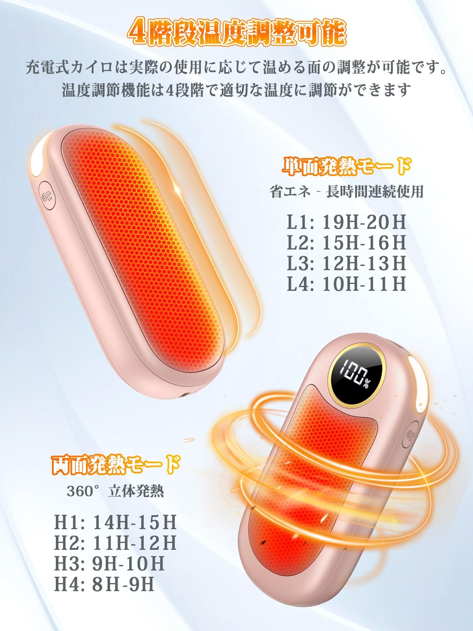 【2種類の加熱モードと4階段温度調節】最新デザインによって、片面加熱と両面加熱を調整できる2つのモードを備えている電子カイロが登場しました。片面加熱はエネルギーを最大50%節約し、より長い使用時間を実現しながら、両面加熱はより速く暖かさを提供します。充電式カイロの表面温度は38~42℃、43~46℃、47~50℃、51~55℃の4段階で温度を自由に調整可能で、組み合わせで8種類の加熱モードを備えています。季節や使用シーン(寒冷地への外勤、アウトドア、スポーツ観戦など)に応じて、手や体を心地よく暖かく保つことができ、最適なモードを選べましょう。お子様やご家族、高齢者、会社員、お友達、恋人など、クリスマスや誕生日、お正月/新年のお祝いに最適です。冬の通勤・通学、お出かけ、旅行、釣りなどで活躍するポケットカイロです