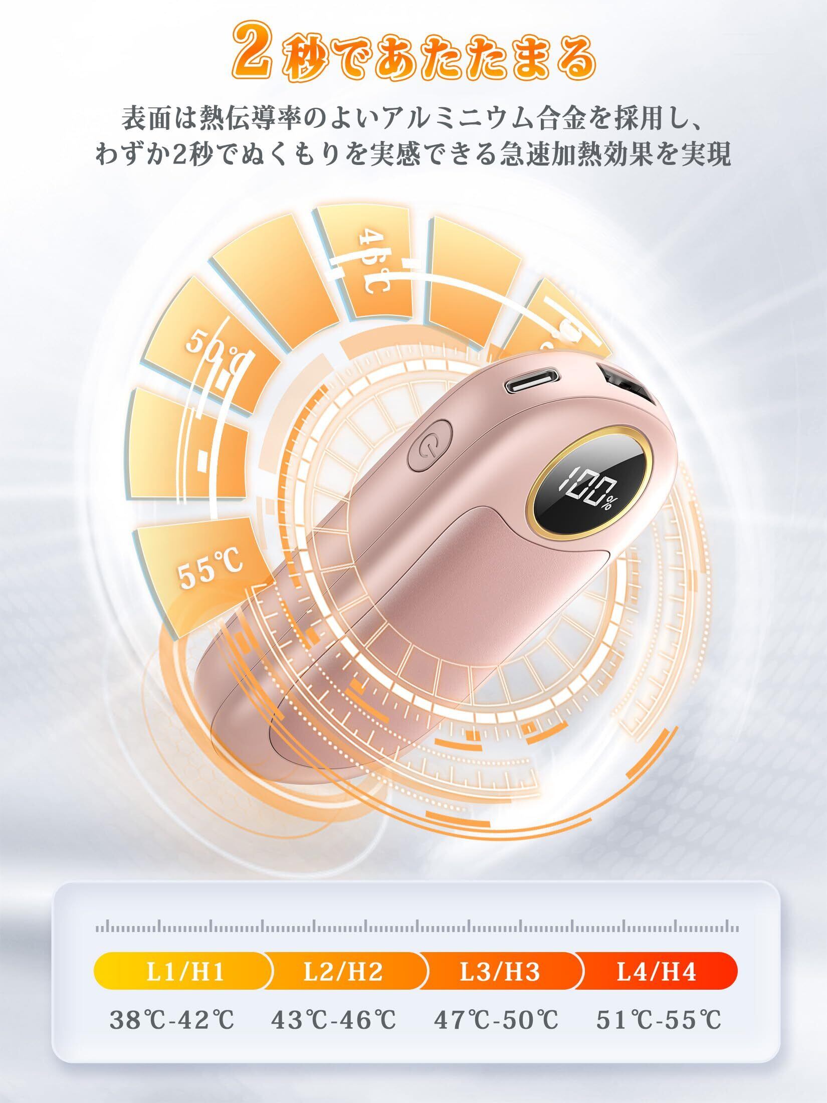 【最大40時間連続発熱とLED残量表示】の充電式カイロ(電気カイロ、電子カイロ、USBカイロ)は7000mAhの大容量バッテリを誇り、長時間の使用が可能で最大20時間暖かさを感じられます。2個セットなので、総計40時間連続発熱を実現できます。一日を通して快適に使いやすいです。カイロの電源を入れて2秒で暖かさを感じられ、優れた熱伝導率を持つアルミニウム合金を通して、急速かつ連続的加熱効果を実現し、より効率的に寒さを防ぎます。手先の冷えを感じた時にすぐに暖を取れるのが嬉しいポイントです。(※使用環境によりまして実際の温度は1~3℃高い/低い場合があります。)寒い冬には、ホッカイロ 電子が手だけでなく足、膝、腰、お腹なども温めることができ、お年寄りやお子様、オフィス及び事務所で働く方にも最適です。LED残量表示で温度やバッテリー残量を一目で確認でき、バッテリーの状態を正確に把握できます。usb カイロは便利なType-C充電ポートを装備し約3~4時間で満充電されます。