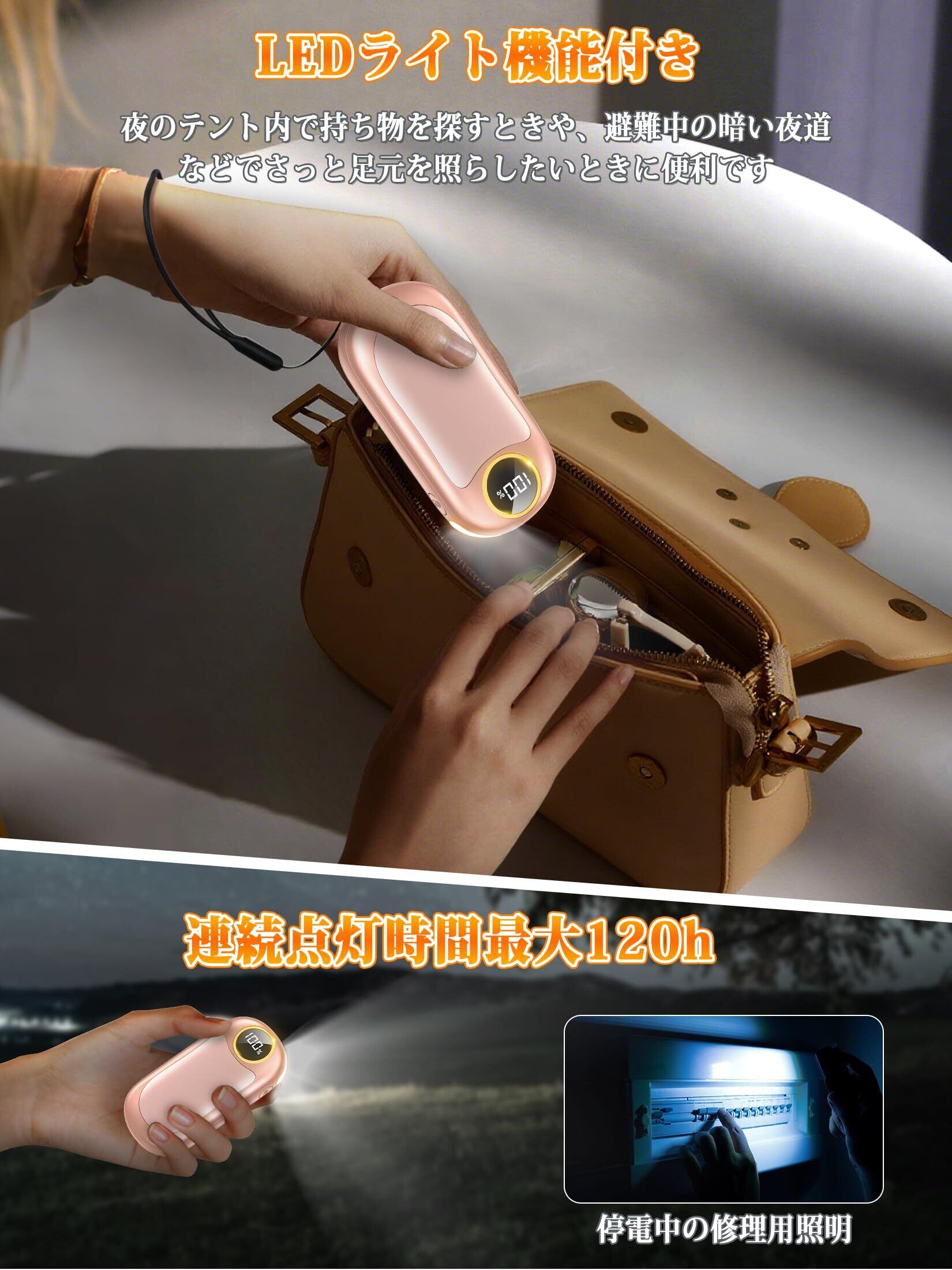 【1台2役携帯便利と防災対策】ポケットサイズで、ポケットやかばんに簡単入れ、持ち運びやすいですさらに、カイロ 充電式はLEDライト機能が付いているため、アウトドアや災害時にも非常に役立ちます。夜のテント内で持ち物を探すときや、避難中の暗い夜道などでさっと足元を照らしたいときに便利。停電時や災害による避難を行う際に、温暖をとりながら明かりも確保できるため、1台持っておけば安心です。充電式なので繰り返し使うことができ、経済的です。多機能でありながら135gのコンパクトなので、またはコートのポケットに簡単に収納でき、外出時にも不便を感じません。電気ホッカイロは日常生活から非常時まで幅広く活躍できる商品です。