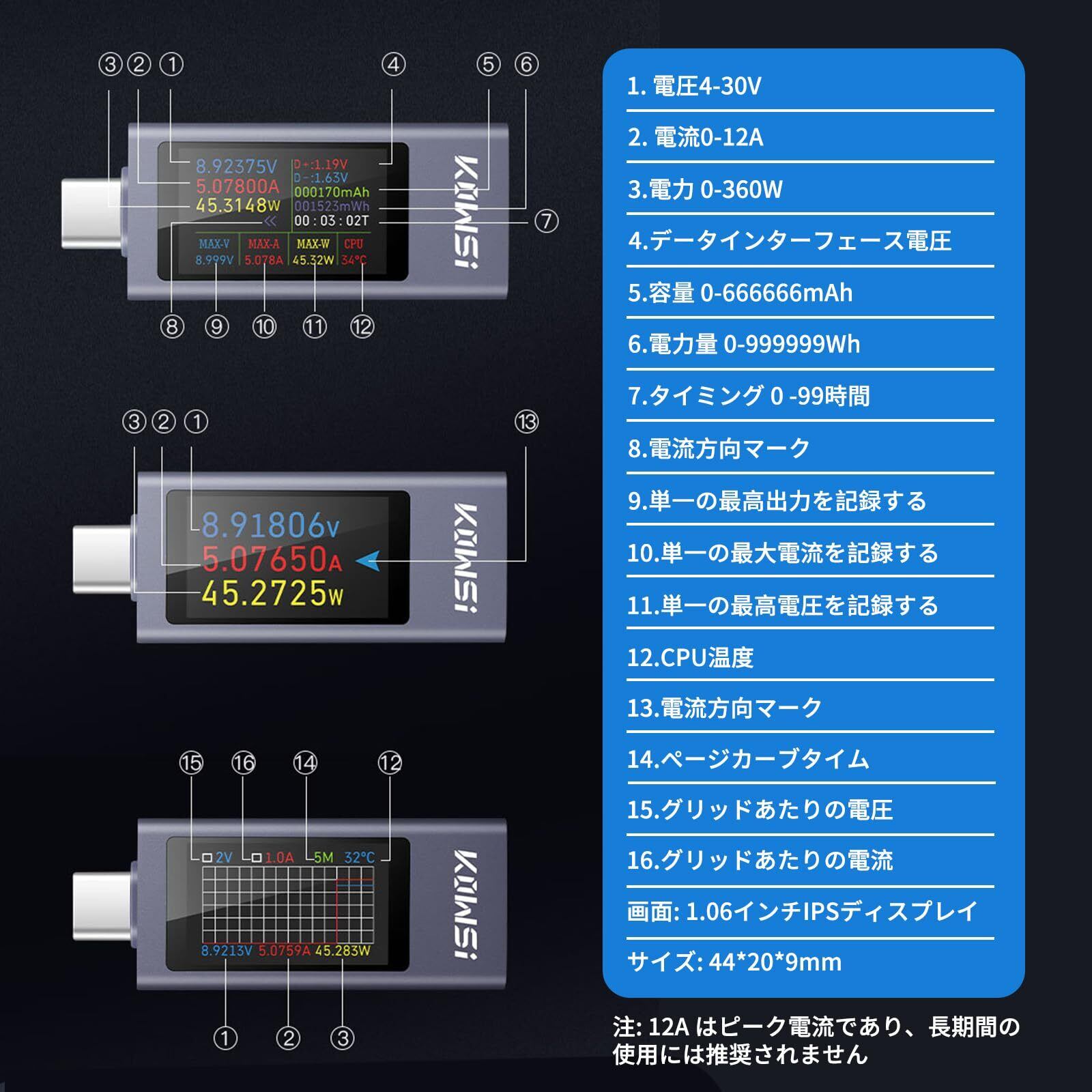 電流 電圧チェッカー、双方向 USB C パワーメーター USB C テスター、USB マルチメーター 4-30V 0-12A 電圧電流容量エネルギーパワーデジタルテスターカラーディスプレイ5 桁の高精度