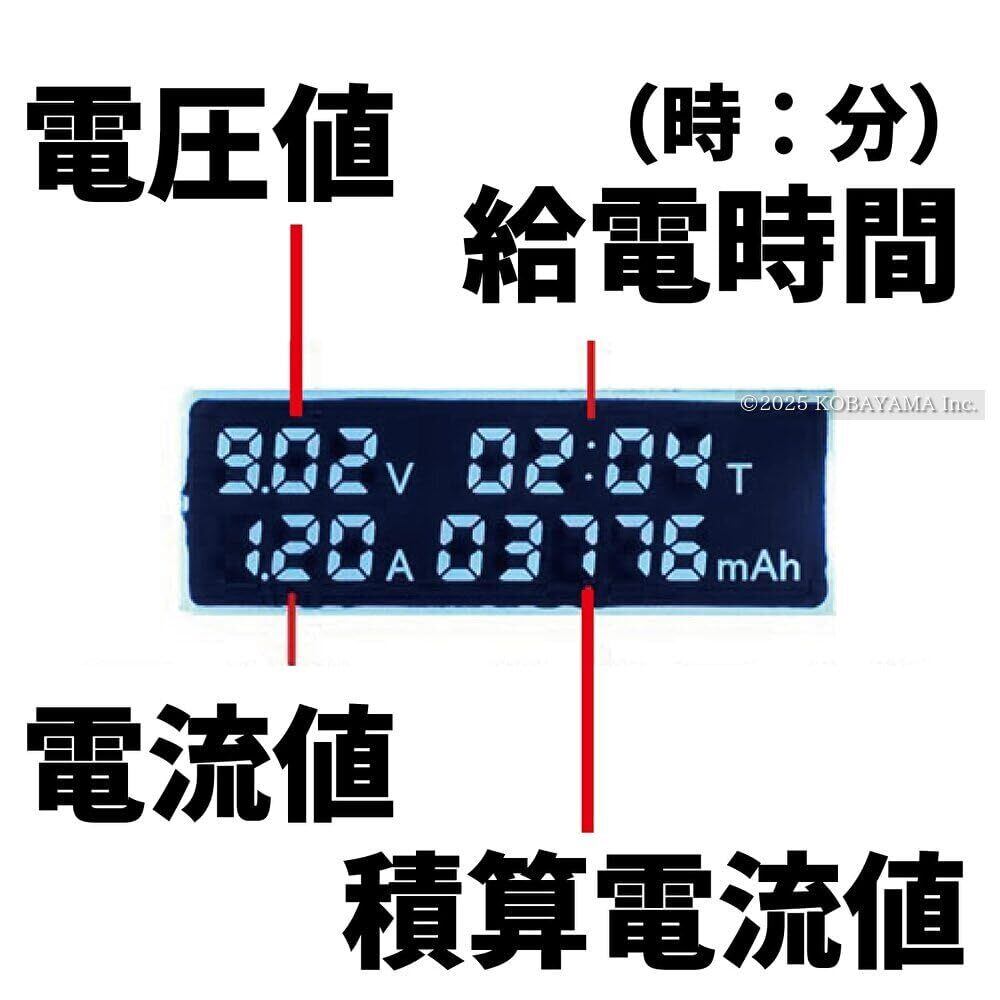 断電記憶機能が付属しており、断電するとき、データを記録できます。電圧と電流だけでなく、電力(電圧×電流)や経過時間、電流量mAh(充電容量)も計算しリアルタイム表示できます。