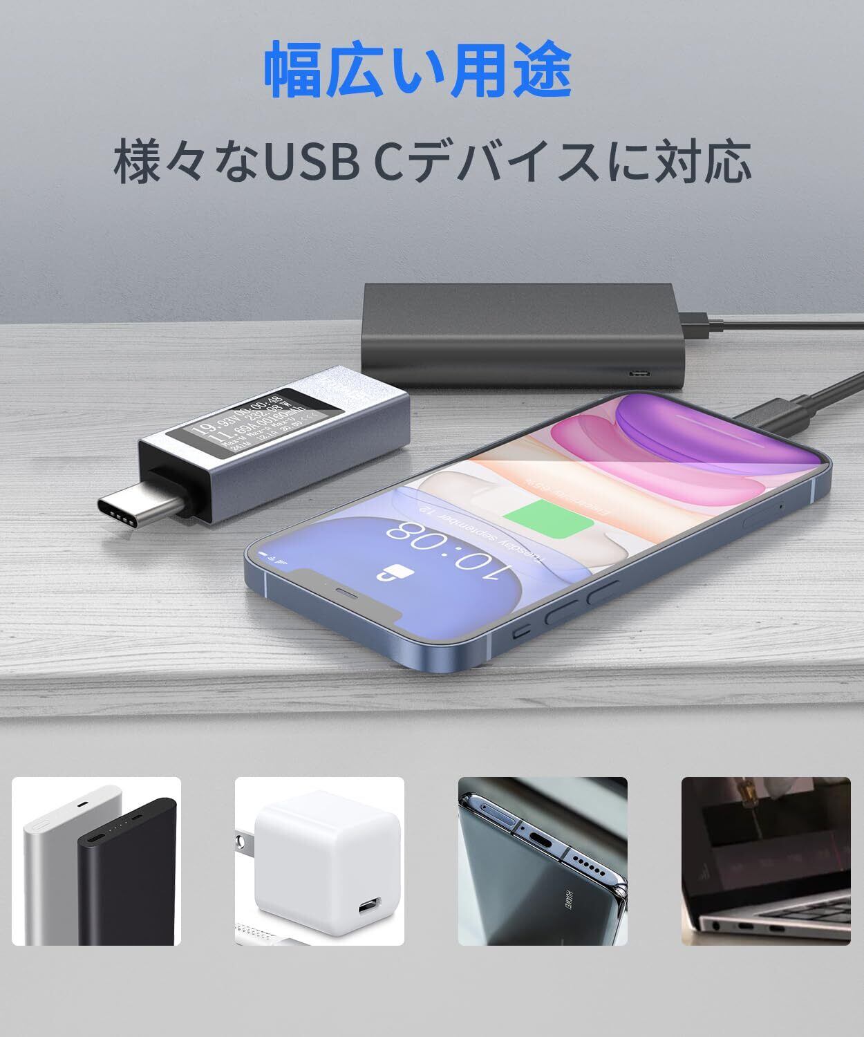 【広範囲】Type-C電圧・電流チェッカーはタブレット、充電器、充電ケーブル、パワーバンクなどのUSB Cデバイスの電圧、電流、電力などを測定できます。
