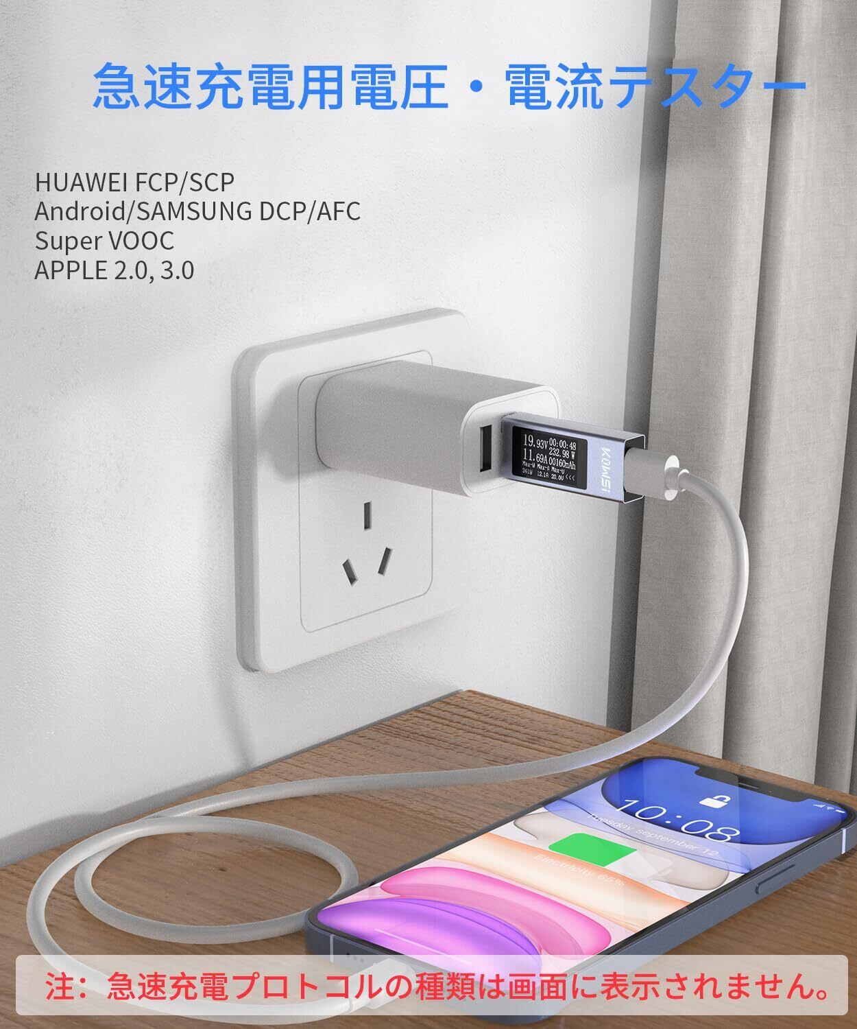 【様々な急速充電テストを対応でき】このUSB Cテスターは、PD2.0、PD3.0、PPS、QC2.0、QC3.0、FCP、SCP、AFC、PE、DASH、VOOC、SuperVOOCなどの急速充電テストをサポートしています。注意:急速充電プロトコルは表示されない
