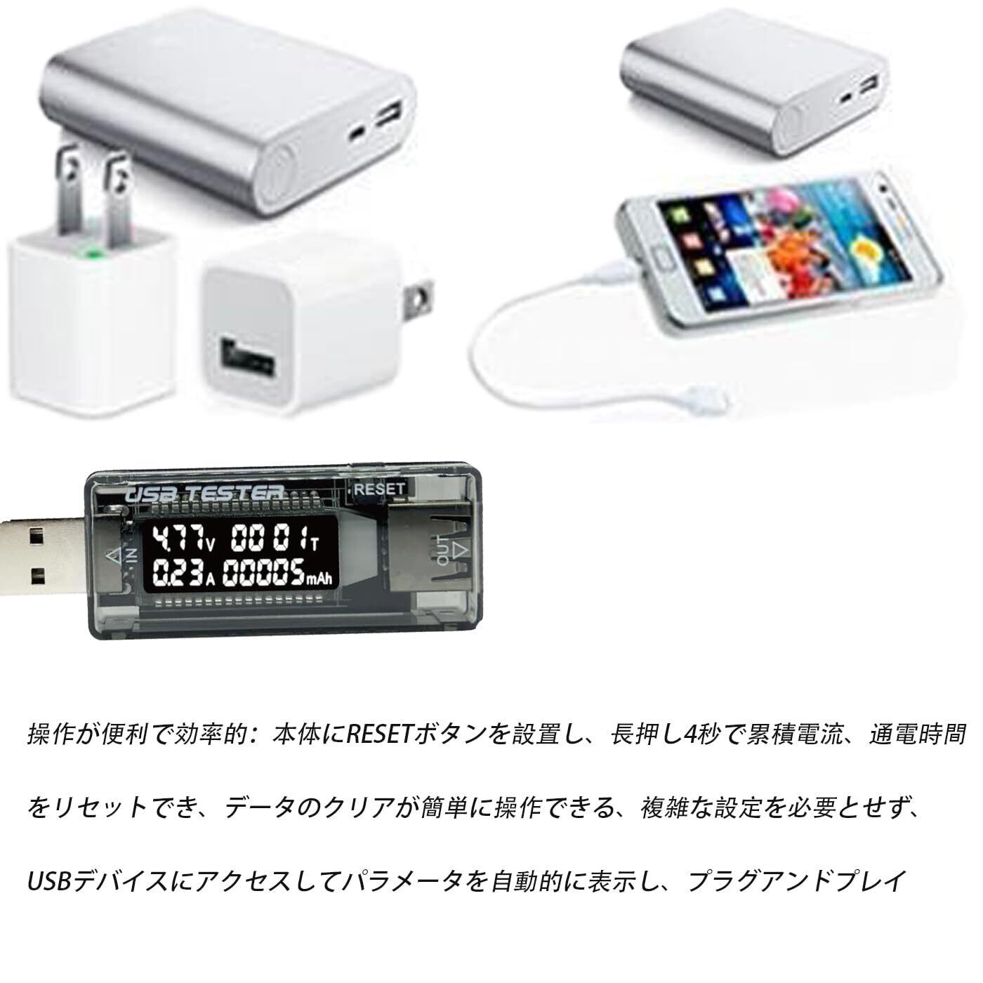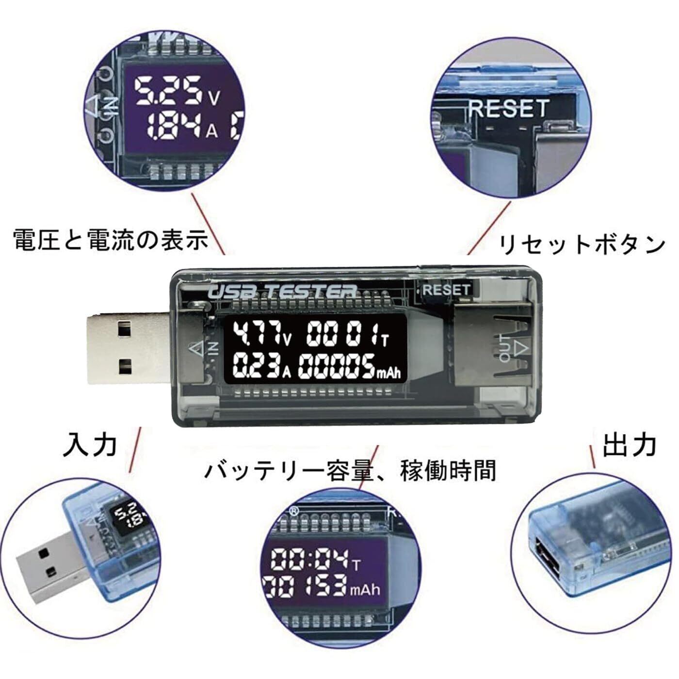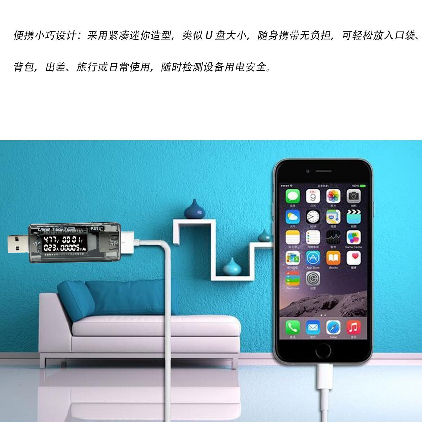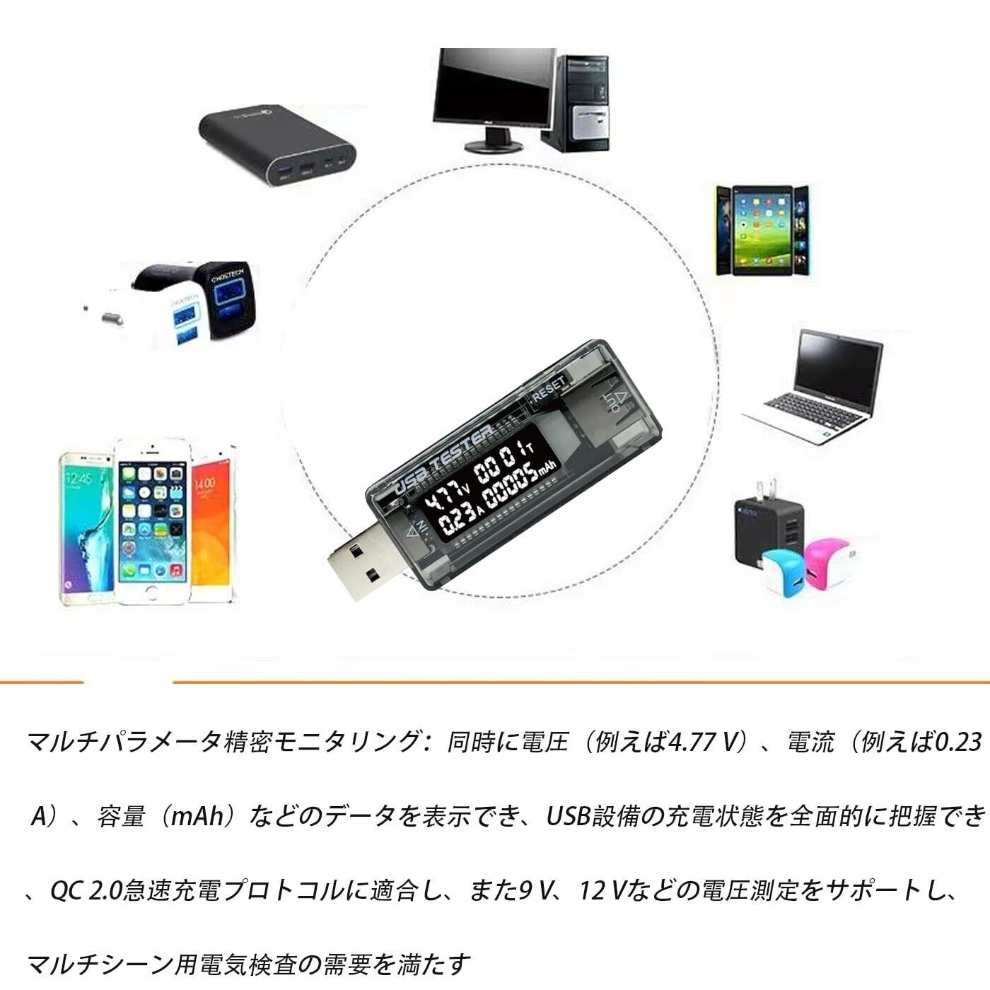 コンパクト設計で、いつでもどこでも手軽に持ち運べる。 本製品はQC 2.0互換のUSB簡易電圧・電流検出器であり、以下の特徴を備えている: 電圧値、電流値、容量、消費電力及び電力を同時に表示することができる、 電圧と電流状況を監視でき、モバイル電源、iPhone、Androidスマートフォンなどの機器の使用安全をする。