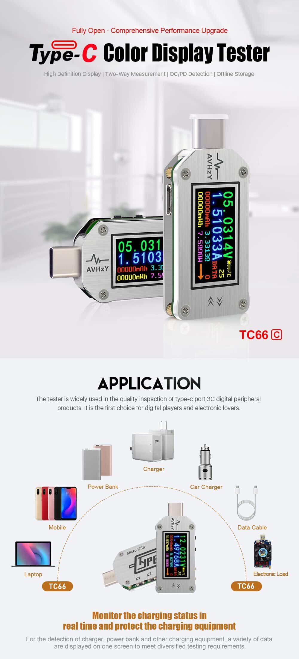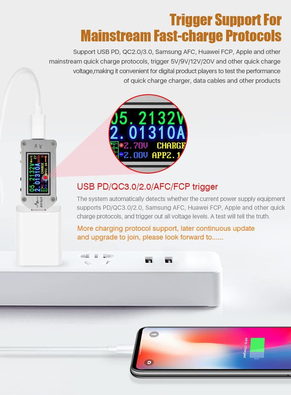 高速負荷認識モード:USB PD、QC2.0 / 3.0、AFC、Huawei FCP、Iphoneおよびその他の主流の急速充電プロトコルをサポートし、5V / 9V / 12V / 20Vおよびその他の急速充電電圧をトリガーして、パフォーマンスのテストに便利にします 急速充電器、データケーブルおよび他の製品の。