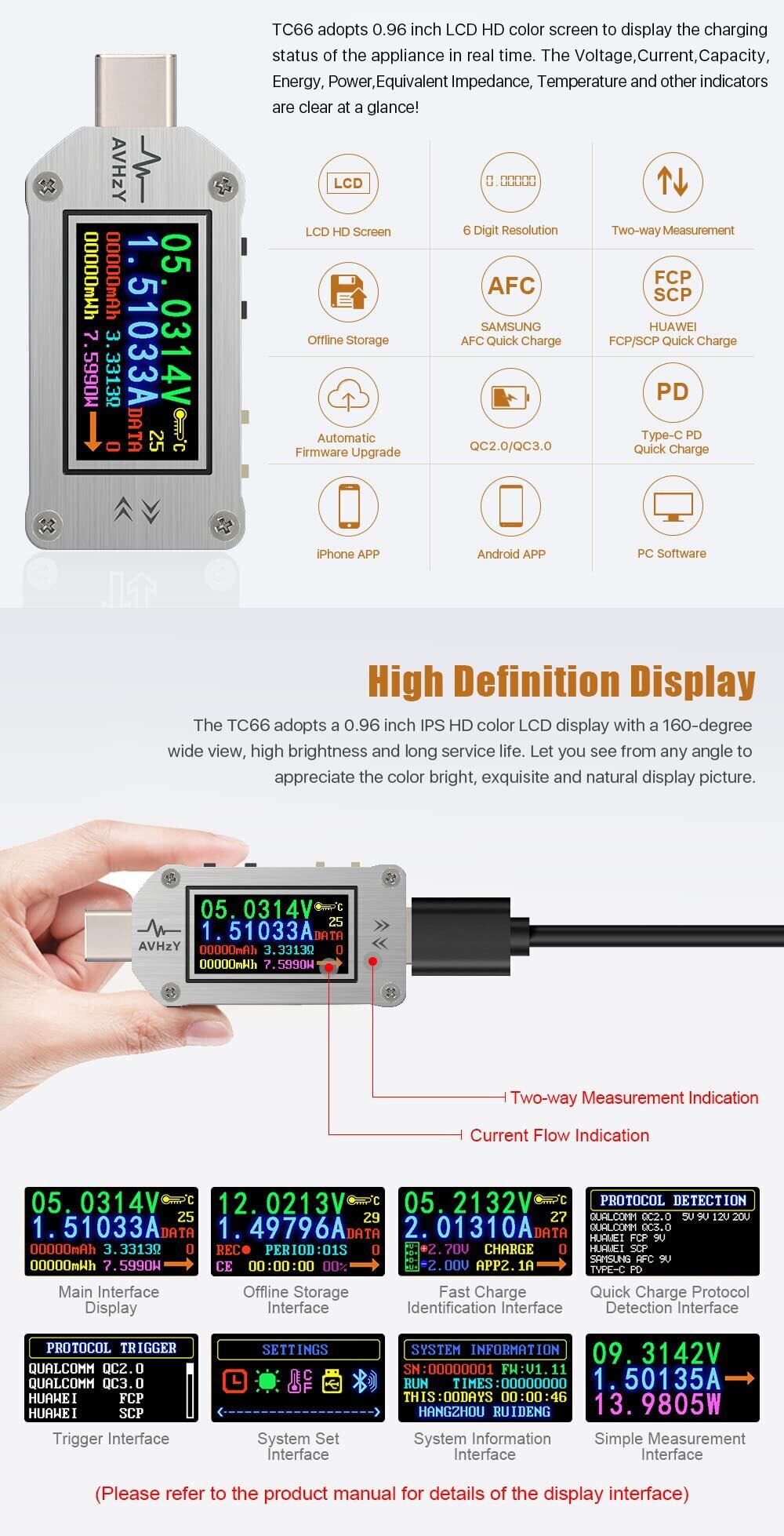 高精細ディスプレイ:0.96インチLCD高精細カラー液晶ディスプレイ、充電状態、電圧、電流、容量、エネルギー、電力、等価インピーダンス、温度などのリアルタイム表示