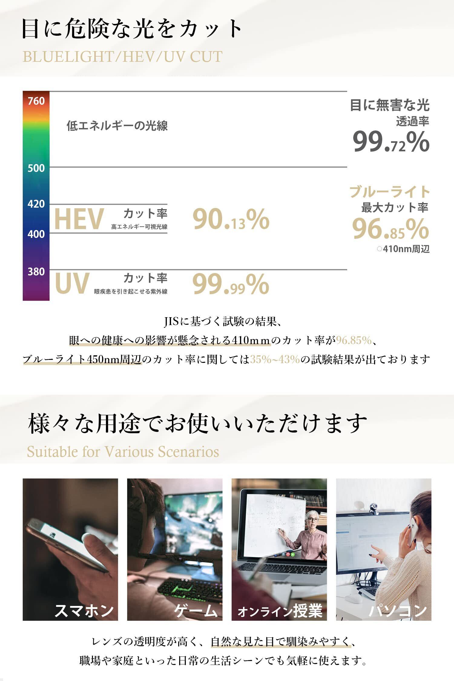 【目に危険な光をカット】目の疲れを及ぼす可能性があるブルーライトを適度にカット(35%-43%程度)することができ、眼疾患を引き起こす可能性があるHEV(高エネルギー可視光線)は99%カットします。そしてUVも99%カットできますので、紫外線対策としてもお使いいただけます。