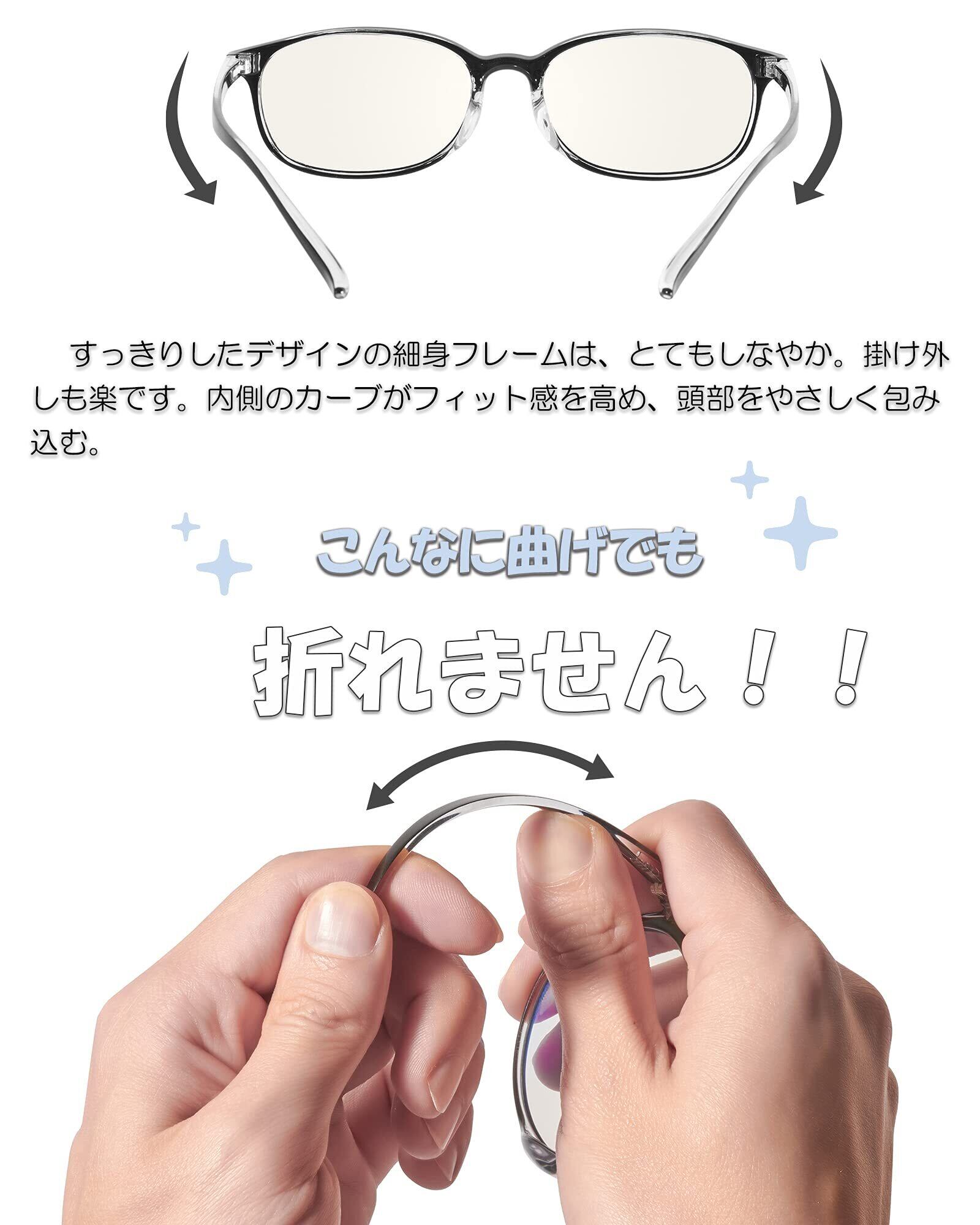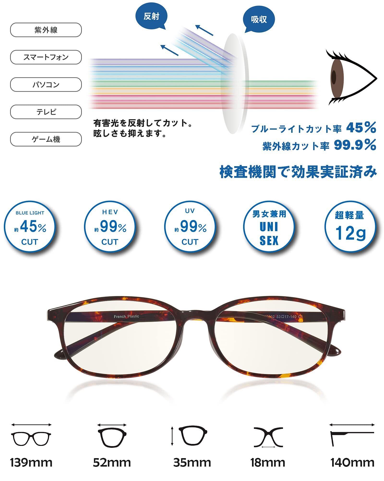 【最新改良版!】ご要望にお応えして ブルーライトカット率45%以上の高機能レンズを新たに搭載!【素材構成】 フレーム素材:超軽量弾力「FRENCH PLASTIC G850」 鼻パッドの形状:フレーム一体型 レンズ:高品質プラスチック/ブルライトカット率45%/UVカット率99%/HEVカット率99%
