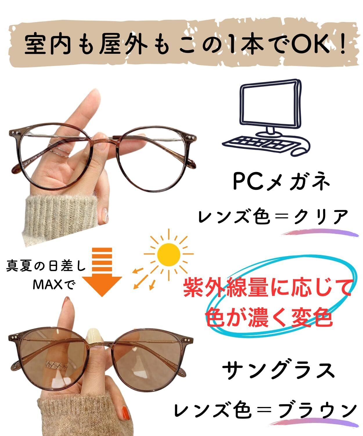 【これ1本でOK!室内外でかけ替え不要の調光レンズ】 おしゃれな伊達めがねが、屋外では紫外線から目元を守るサングラスに早変わり、UV400レンズが紫外線を99%以上カットし眩しさを抑え大切な瞳を保護します。室内に入ればクリアに戻り、PCやスマホから発せられる有害なブルーライトを効果的にカットしてくれる頼れるPCメガネに。目の疲れやかすみを軽減し、一日中快適な視界を提供します。 ※本製品は、紫外線量に応じてレンズの色が変化する調光タイプです。 車内ではフロントガラスが紫外線を通しにくいためレンズの色変化が少なく、運転中のまぶしさ軽減を目的としてのご使用には向いておりません。