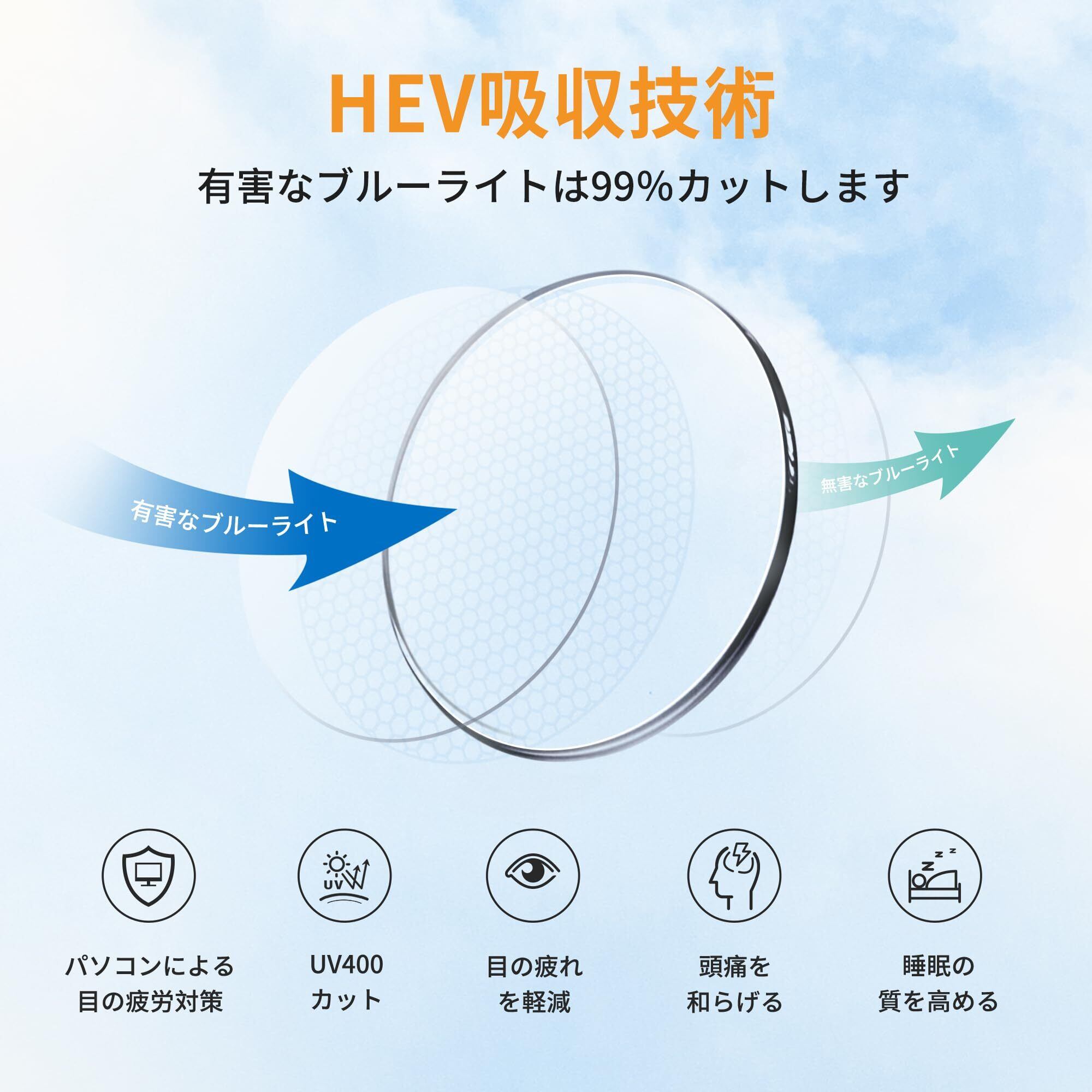 ブルーライト対策:ブルーライトカットメガネは、有害なブルーライトと紫外線をカットし、目をやさしく守ることができま す。さらに、目の周りの皮ふにも保護効果があり、スマホまたはPCを長時間使う方におすすめです