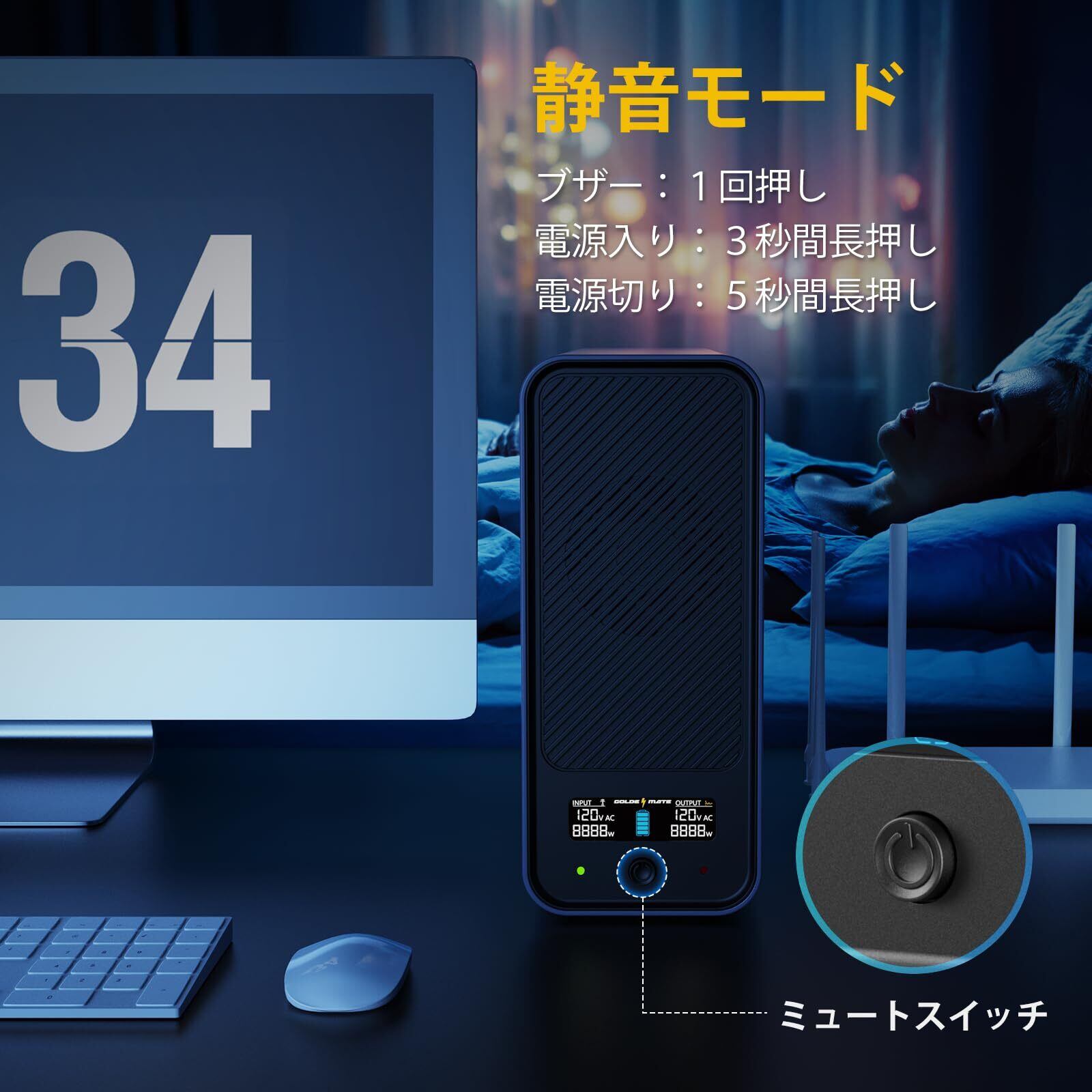 【アップグレード機能&静音】 UPS 1000VA Pro/800Wにミュート機能を追加されました。電源異常時、過負荷時、バッテリー残量低下時のアラーム音を電源スイッチでミュートにできるようになりました。また、空冷ファンのノイズが改善されました。新たに更新された冷却ファンは40 dB以下のノイズレベルで動作します。電源ボタンについての説明:1. 電源入り:3秒間長押し。2. 電源切り:5秒間長押し。3. ブザー停止:1回短押し。商品のカラーについての説明:正面と背面はブラック、側面および上下部分はグレーに近いカラーで構成されており、全体としてはグレー寄りの印象です。