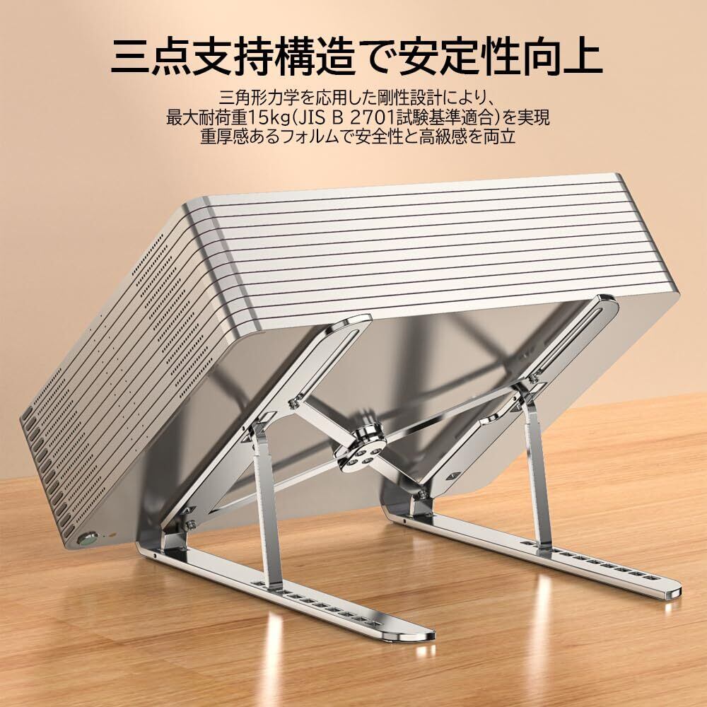 【優れた安定性&滑り止め設計】 スタンドの上面と底面には高摩擦力のシリコンパッドを配置。ノートパソコンがズレる心配なく、安定した作業環境を提供します。さらに、三角形の構造と強化合金素材により、耐久性と安定性を両立。どんなデスクでもしっかりと固定されます。※水気のある場所や不安定な台での使用は避けてください。