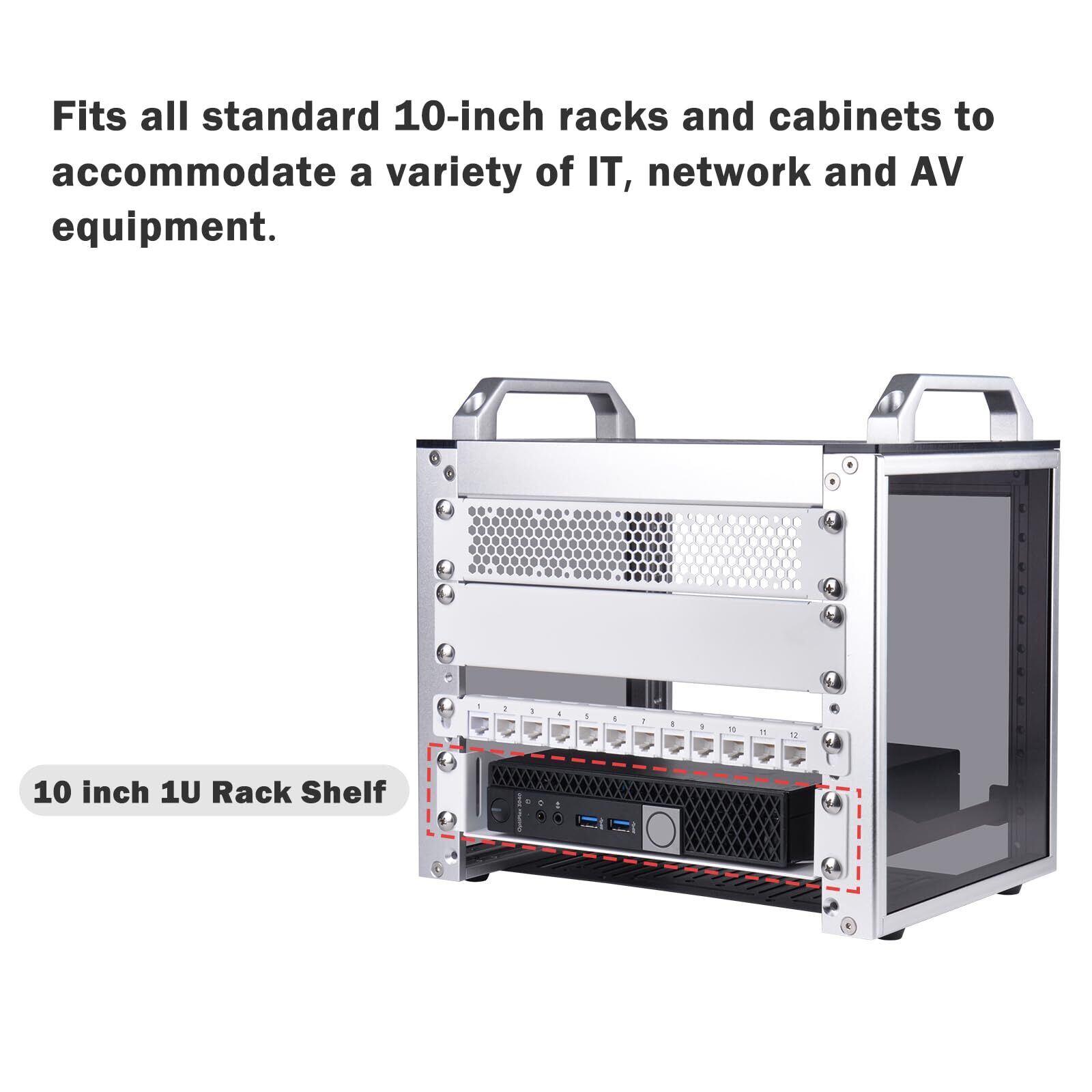 多用途な機能:この固定ラック マウント シェルフは、標準の 10 インチ ラックまたはキャビネットに適合するように設計されています。ミッション クリティカルなハードウェア用の追加のストレージ スペースを提供し、ツールやオーディオ/ビデオ アクセサリを保管することもできます。