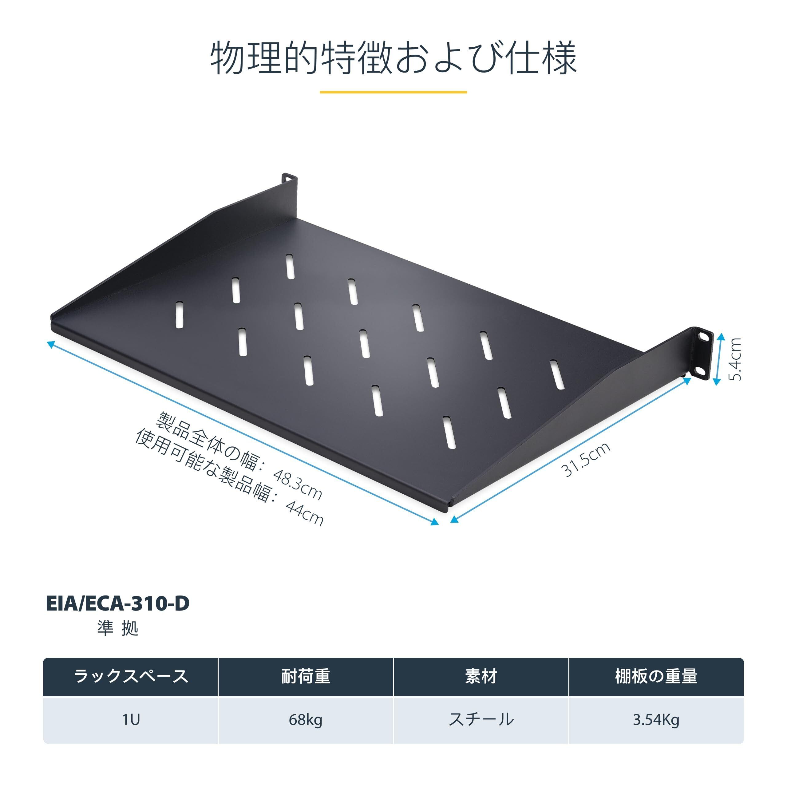ユニバーサル19インチ棚板:EIA-310準拠の19インチサーバーラックまたはキャビネットに適合する放熱スリット付き1Uネットワークラックシェルフ。データ、IT、ネットワーク、またはラックマウント非対応機器に対応。取り付け奥行き31.5cm
