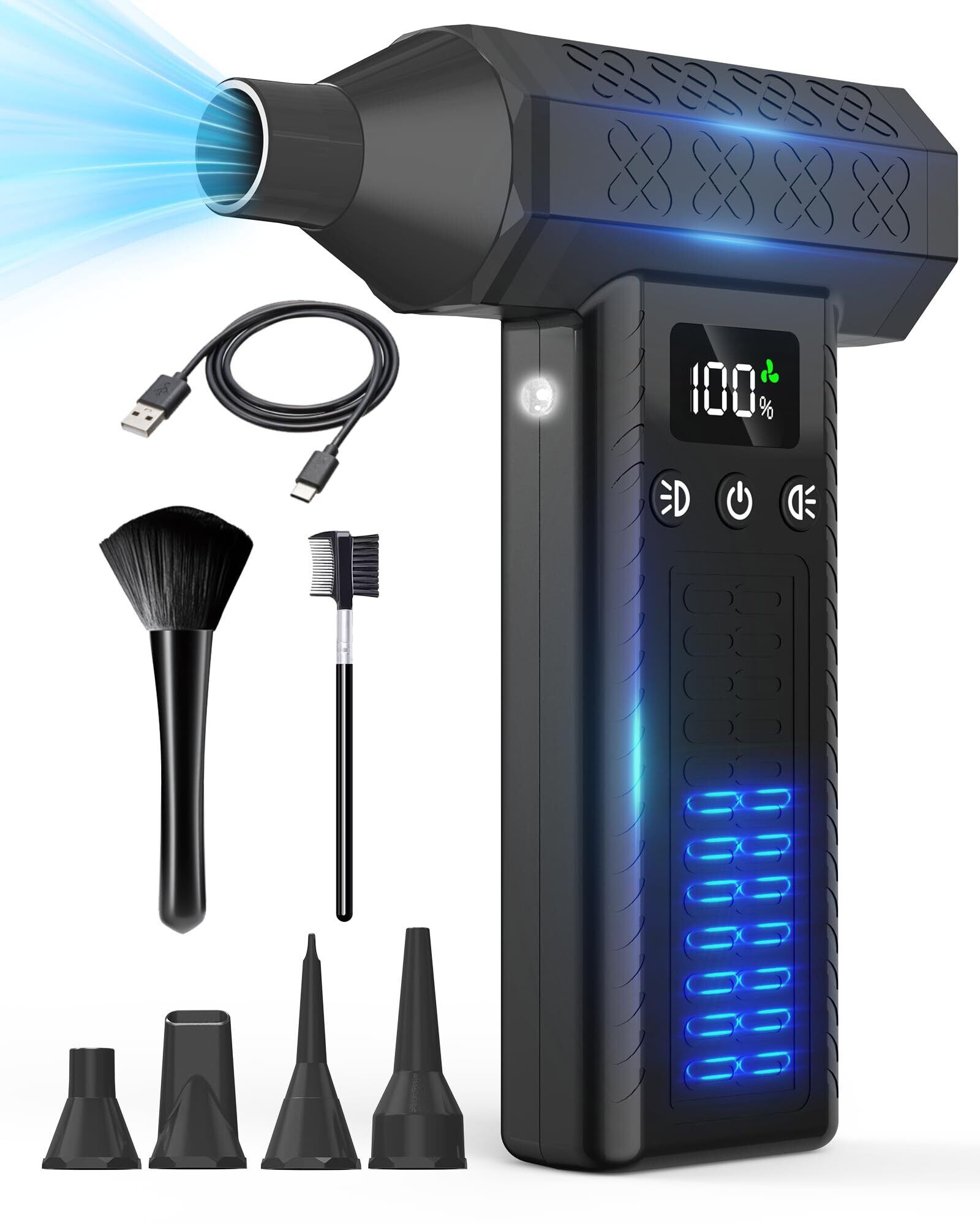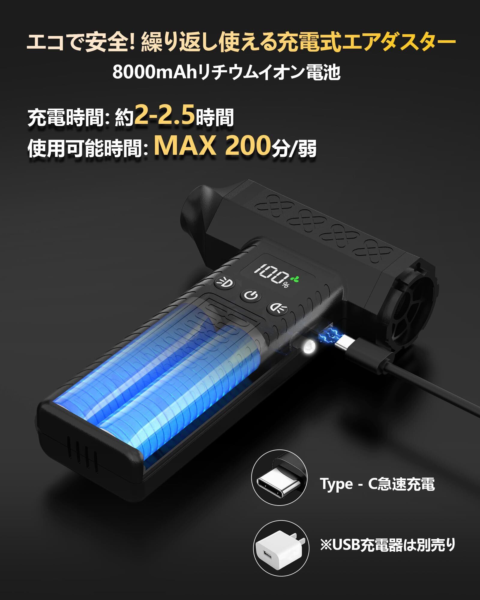 【100%真鍮超強力ブラシレスモーター&8000mAh大容量バッテリー&急速充電可能】アップグレードされた超強力モーターを採用、コンピュータやその他のデバイスの隅々からほこりを吹き飛ばすことができます。場所を選ばずどこでも簡単に使えるようになりました。8000mAhの大容量リチウムバッテリーを内蔵しており、約2-2.5時間フル充電で最大200分使用可能で、各種作業の円滑な完了を支えることができます。また、USB-C充電ポートは急速充電に対応しており、高速で効率的な充電が可能です。