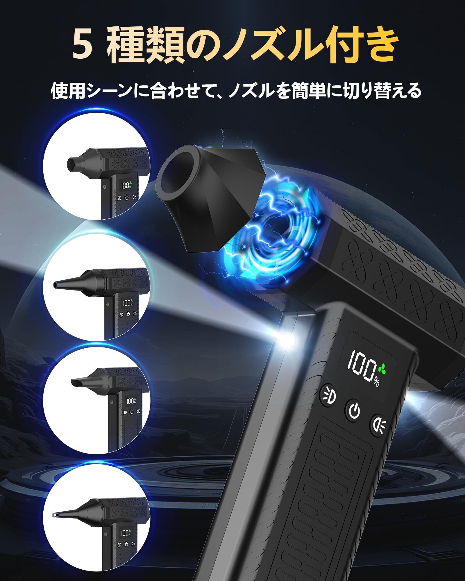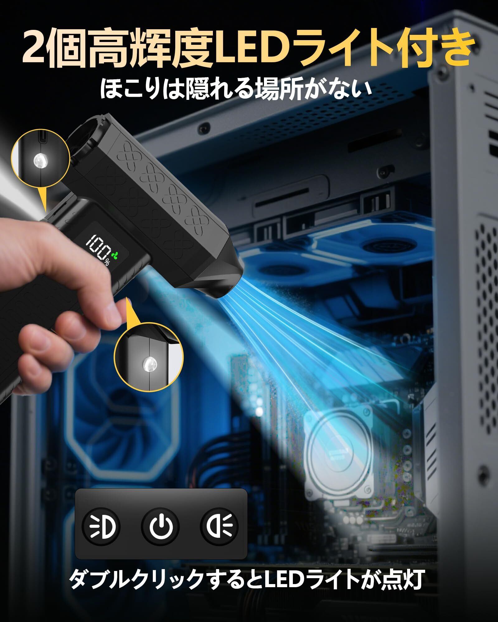 【5種類のノズル付き&高輝度LEDライト2つ搭載】使用シーンに合わせて、ノズルを簡単に切り替えて、あらゆる場所をキレイに! 丸型ノズル:広い範囲のホコリの掃除。長ノズル:パソコンなどの掃除。平型ノズル:車の内装などの掃除。ショートノズル:フィルターなどの掃除。エアーノズル:エアベッドや浮き輪などの空気入れ。細ブラシ:フィギュアなどに。両面ブラシ:精密機械に。安定した風量で、様々な用途にお使いいただけます。最新型のLED強光チップを採用し、ライトの使用寿命は10000hに達します。明るく、光が均一。両端の異なる機能にそれぞれライトを搭載、それぞれ操作でき、夜間や隅などの暗い場所でもはっきり見えてお掃除できます。