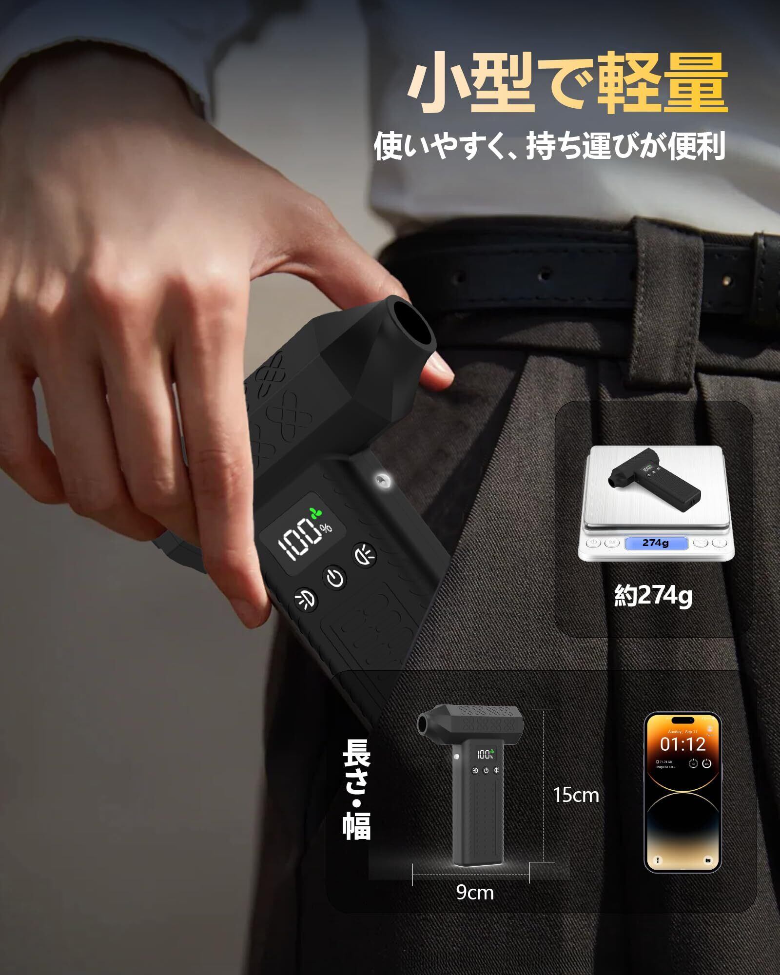 FOXKING 最強風力120m/s 洗車 ブロワー 最強 300000rpm電動エアダスター 小型ミニブロワー (3段風量調整· 8000mAh· 200分連続作業可) 充電式ブロアー 2個LEDライト付き 274g軽量 コードレス LCD数字ディスプレイ搭載 純真鍮ターボブラシレスモーター カメラ/pc/キーボード/パソコン疾風掃除 水滴飛ばし (ブラック)