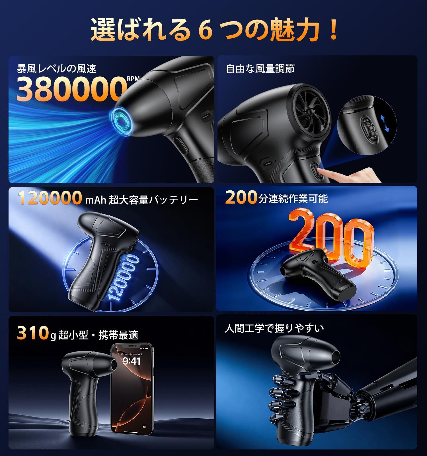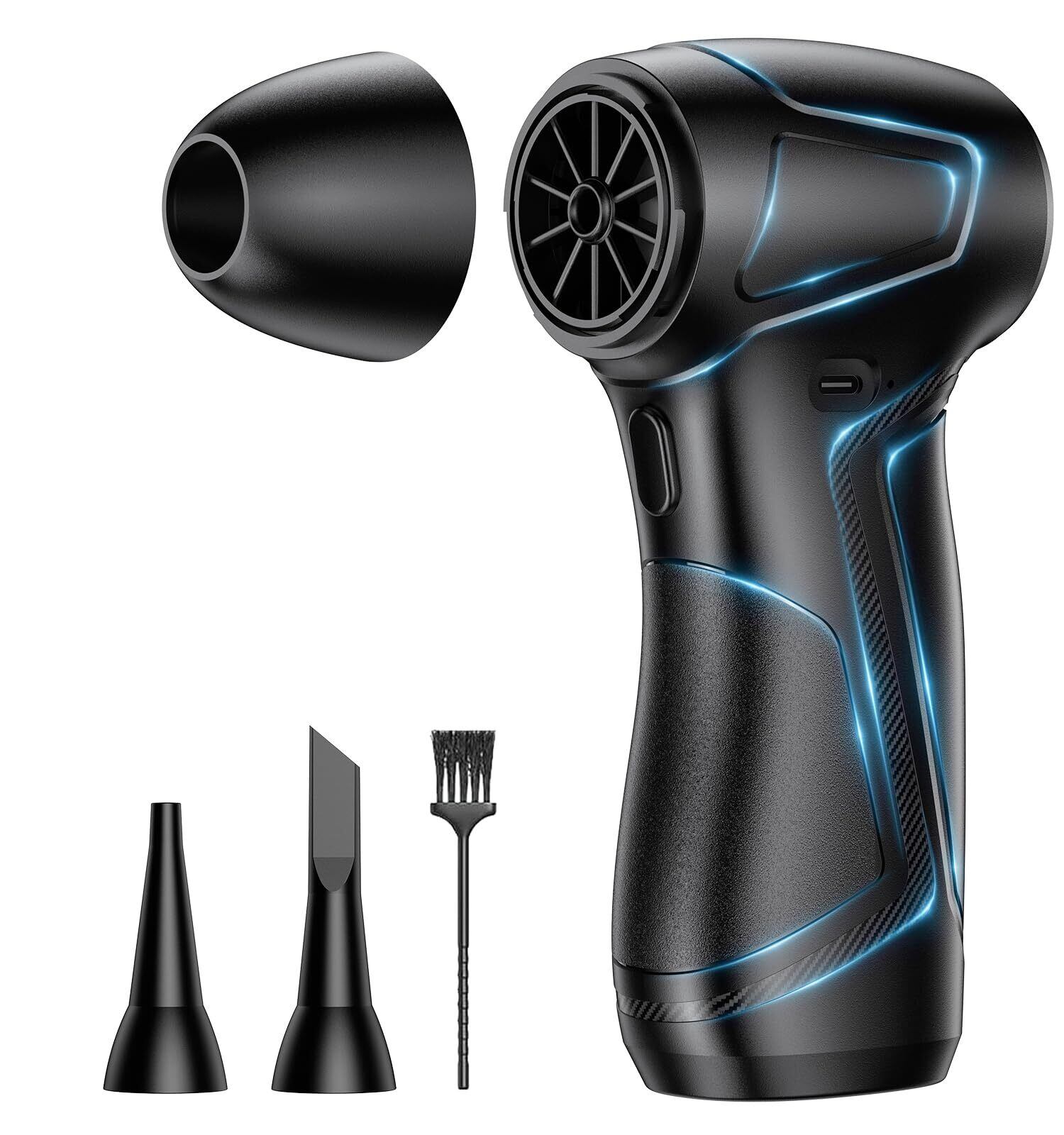 【大容量バッテリー&Type-C急速充電で長時間駆動】AI保護機能搭載の大容量12000mAhバッテリーを内蔵し、1回の充電で最大200分の使用が可能。環境に優しく、使い捨てのエアダスター缶からの卒業ができます。Type-C急速充電に対応しており、車載充電器や家庭のUSBポートでも簡単に充電可能。外出先でも小型軽量設計のため持ち運びやすく、家・オフィス・車内どこでも快適にご使用いただけます。【注意】充電中の使用は危険なため、必ず充電完了後にご使用ください。