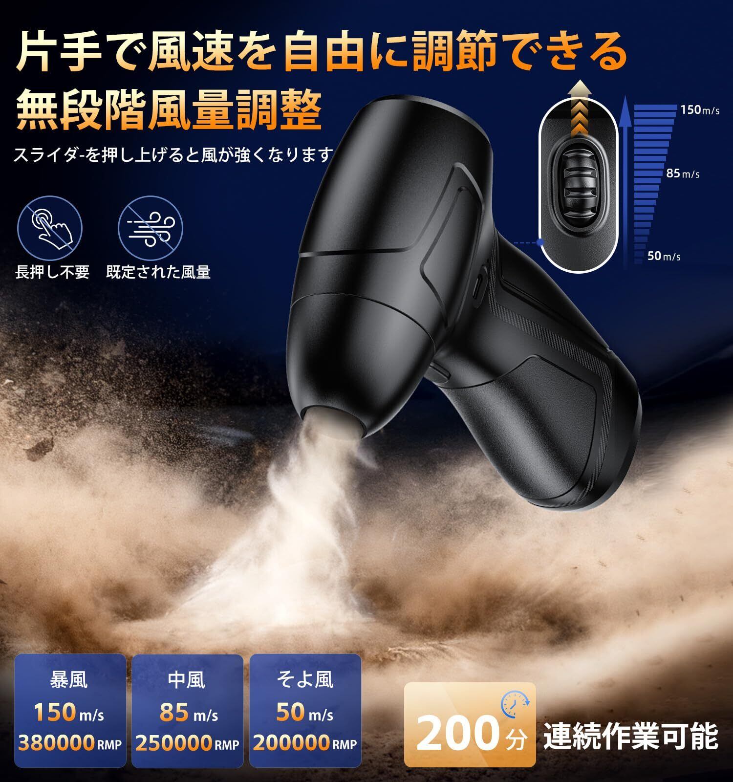 エアダスター 電動ブロワー 洗車【暴風級150m/s・380,000RPM・無段階風量調整・200分連続使用可能】X1小型軽量310g・コードレス 空気入れ USB-C充電(12000mAh)鍵盤/PC/カメラ掃除・水滴/落ち葉飛ばしに最適 ブラシレスモーター・長時間稼働 3種類ノズル付属 黒