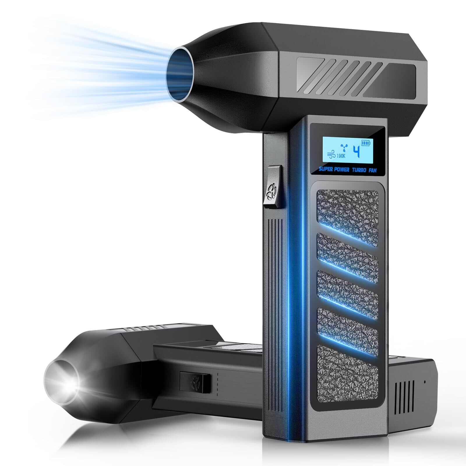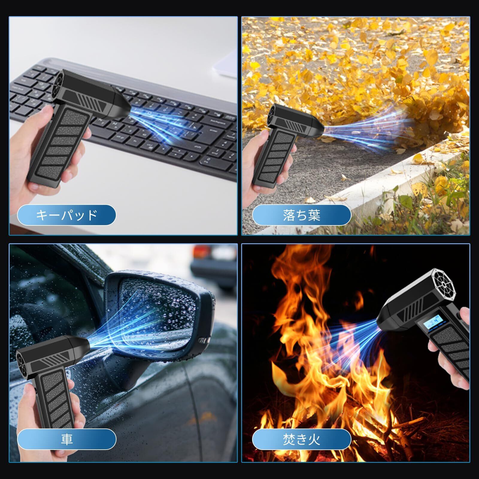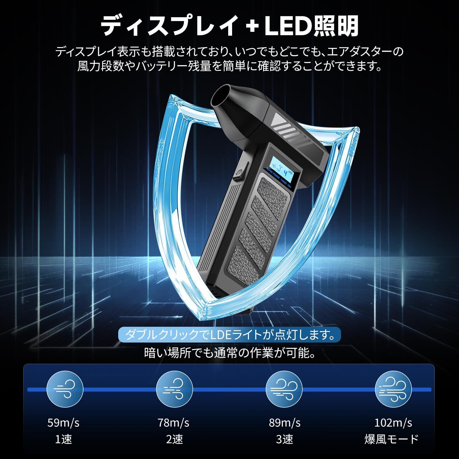 【4 段階風量調節:電動エアダスターで全シーン対応】電動エアダスターの風量をワンタッチで 4 段階切り替え可能。弱風量で PC 内部掃除、強風量で洗車・庭掃除に対応。LED ディスプレイでバッテリー残量・風量を確認でき、操作が簡単。1 台のエアダスターで、様々な使用シーンのニーズを満たせます。