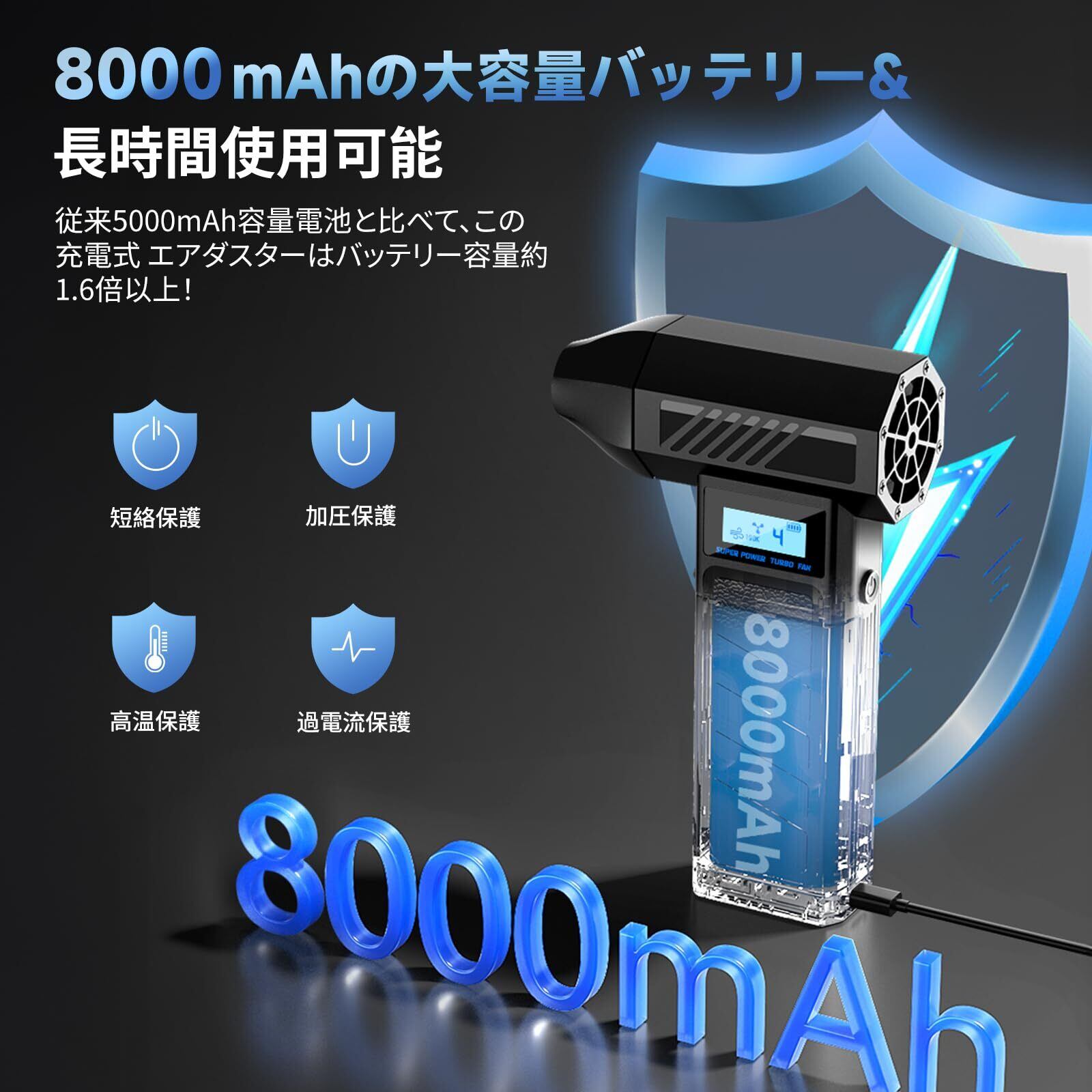 【8000mAh 長续航:充電式エアダスターの使い勝手 UP】電動エアダスター に 8000mAh リチウムイオンバッテリーを内蔵,弱風量モードで最長 200 分連続使用。USB-C 急速充電対応で 90 分で満充電,PC・車載充電器でも充電可能。AI 過充電保護でバッテリー長寿命化,外出先でもエアダスターを切れ目なく使用できます。