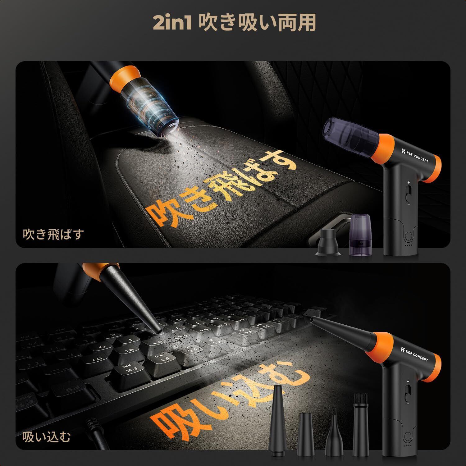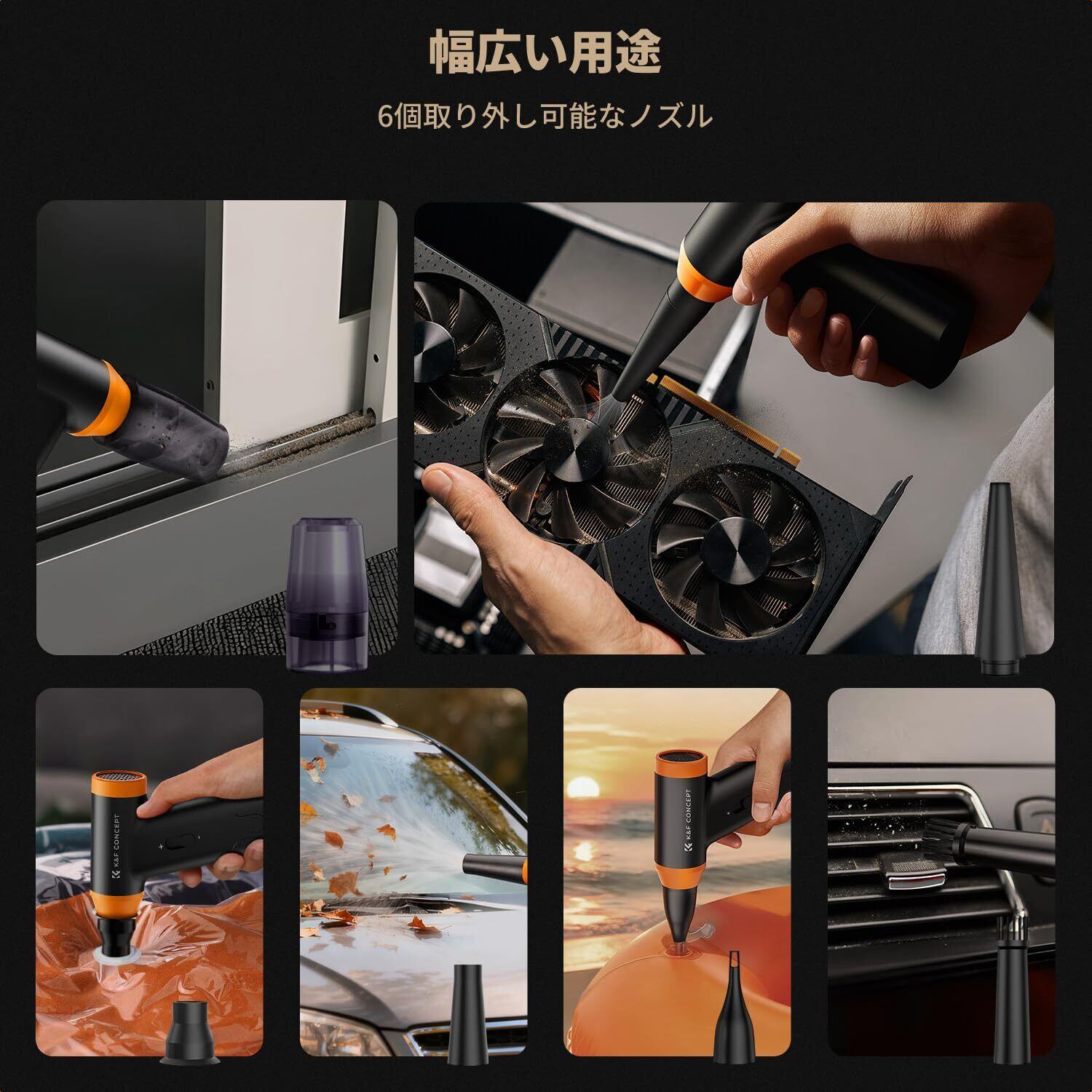 K&F CONCEPT 電動 エアダスター ブロワー 150000RPM 超強力 6種類ノズル付 無段階風量調整 2in1動作モード USB-C充電式 大容量バッテリー 長時間使用 洗車/車内/PC/キーボード/カメラ/BBQ/家具掃除 空気入れ 5枚クリーニングクロス入り 収納袋付 ブラック