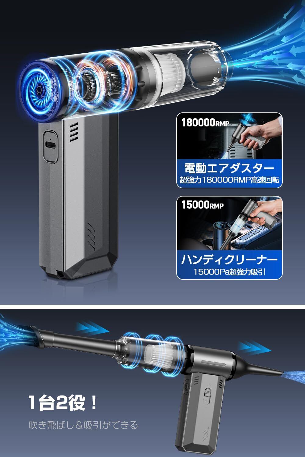 エアダスター 電動エアダスター ブロワー 最強 洗車 ブロアー 2025夏新開発 【2in1 エアダスター&ハンディクリーナー】 吹き飛ばし&吸い込む 車載掃除機 超強力 180000RMP高速回転 75m/s圧倒的な風速 Type-C充電式 10000mAhバッテリー コードレス 軽量 無段階風量調整 PC掃除/キーボード/家具/車内/エアコン/洗車用 父の日 プレゼント