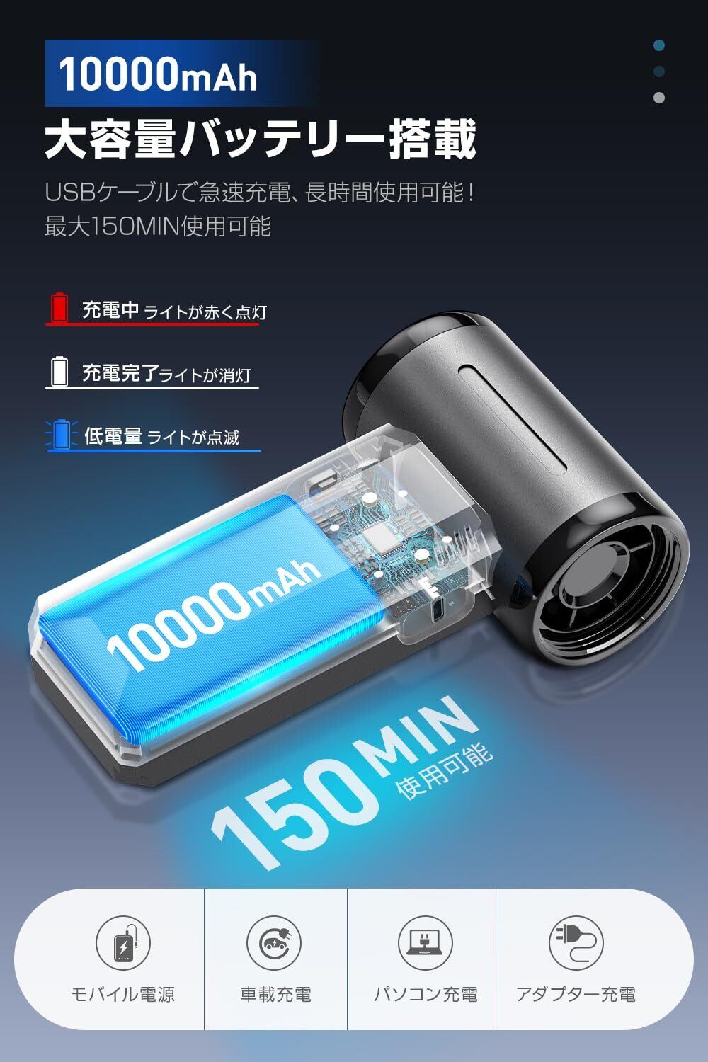 ✨③【大容量バッテリー搭載で長時間使用OK 洗車 ブロワー 最強】USB Type-Cでサクッと充電、10000mAhの大容量バッテリーで最長150分の連続使用が可能。LEDランプでバッテリー残量も一目瞭然。赤く点灯で充電中、消灯で満充電、点滅は残量が少ないサイン。コードレス&長時間駆動だから、洗車やアウトドアでも使いやすく、ブロワー 洗車用としても重宝される1台です。