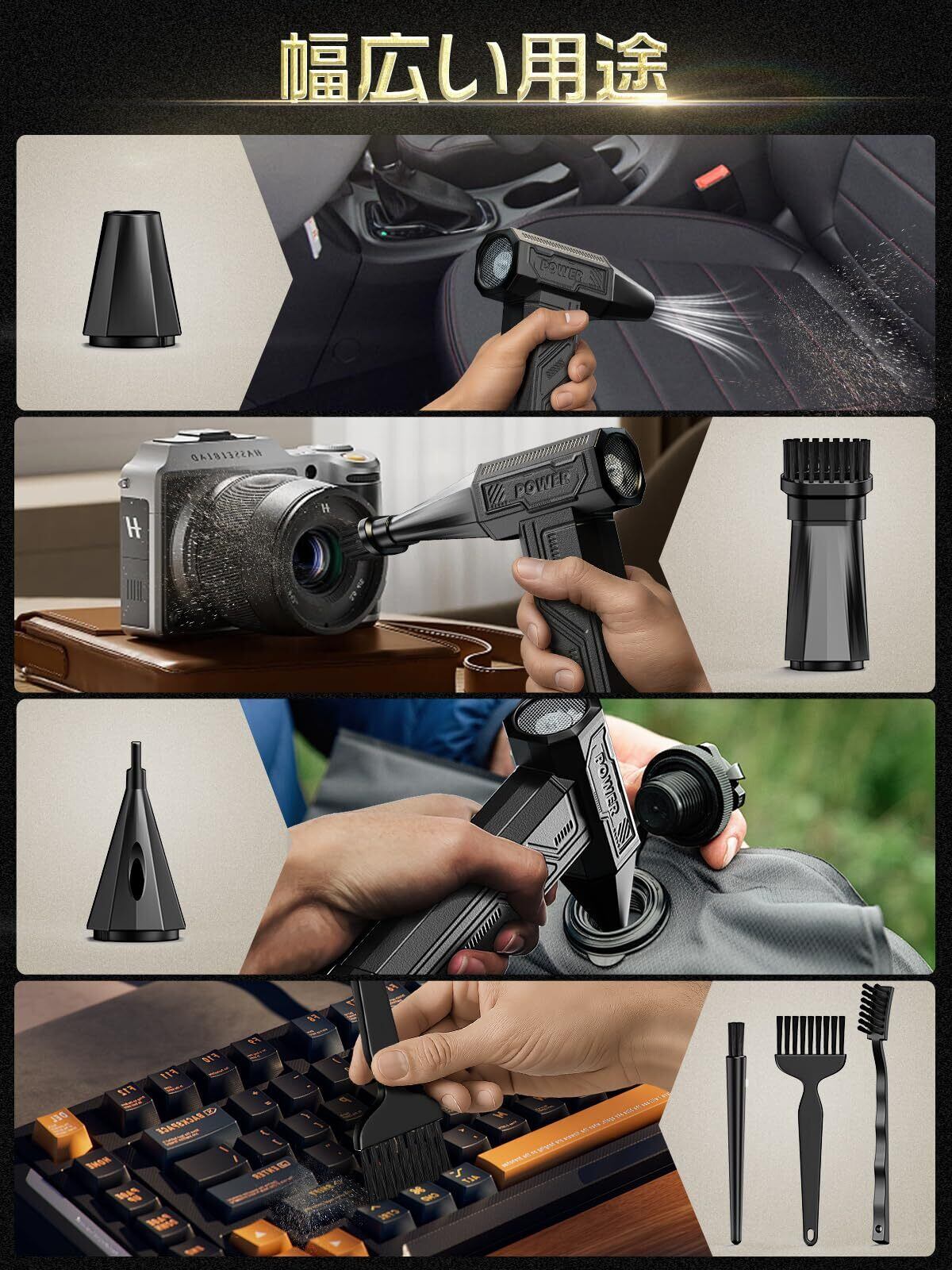 【4段階風量調整&3ノズル+3ブラシ付属】このエアダスターは4段階の風圧切替をワンタッチで反映できます。強力な風量で、落ち葉や砂ぼこり、水、雪などを一瞬で吹き飛ばします。さらに、3種類のノズル(細口/広口/集中噴射)と3種類のブラシ(平型/細毛/硬毛)を付属します。室内や玄関タイル、窓サッシなどの清掃に最適です。