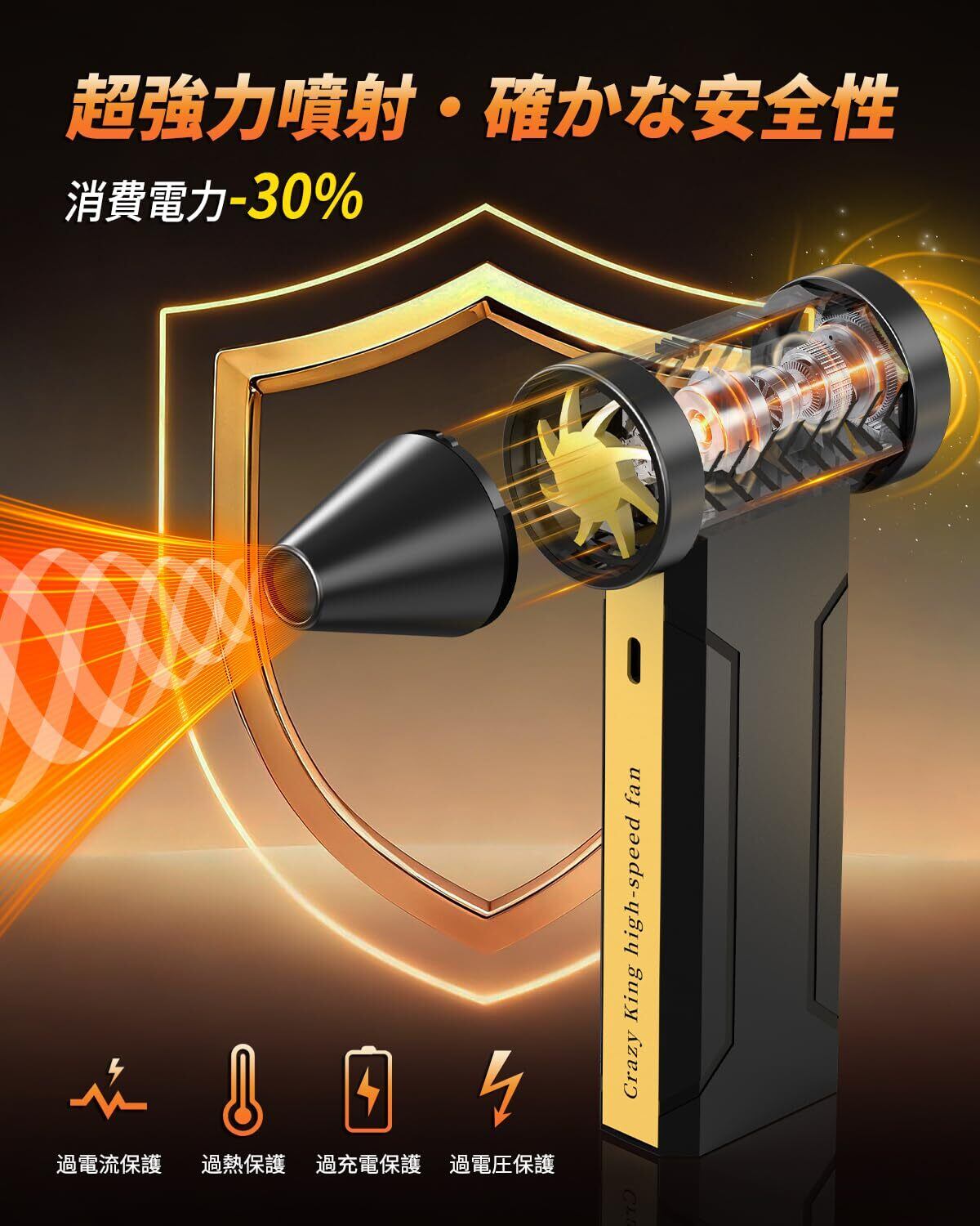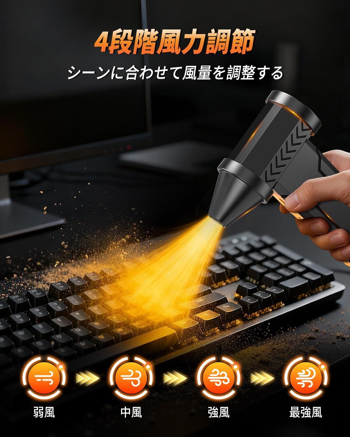 【4段階風量調整&省エネ】このエアダスターは4段階の風圧切替をワンタッチで反映できます,風量は利用シーンに合わせてお好みの強さに調整出来。ボタン一つで、風量を段階的に増減させることができます。使い捨てエアダスターの空缶処理不要で、安全・エコ・無臭な持続型ソリューション。使用コストを削減、長期的な経済性を実現。