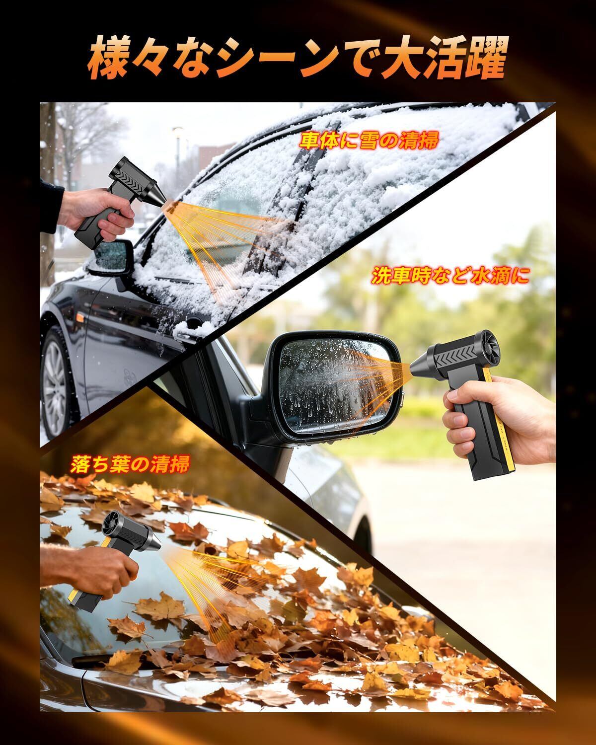 【電動エアダスター&超強力噴射】従来の使い捨てエアダスター缶と比べて、繰り返し使えて経済的&ガス臭なし!もう面倒な空き缶処理ともお別れです。200,000rpmの高出力モーターが最大風速80m/sを実現し、洗車 ブロワー 最強クラスのパワーで、従来の電動エアダスターの約10倍から15倍ものスーパー噴流力を発揮!エアダスター pcや精密機器の清掃にも安心。隙間のゴミもパワフル吹き飛ばす!落ち葉・砂ぼこり・水たまりまで全て解決!ジェットぶろあー 洗車にも最適で、サッシの溝や玄関タイルの隙間、車の下部の水切りなど、今までの道具では届かなかったエリアもらくらく掃除できちゃいます。