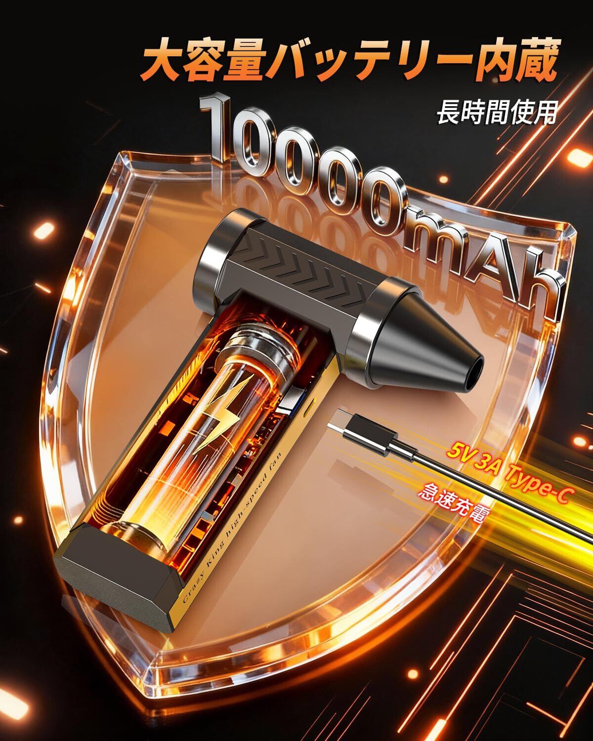 【10000mAh大容量バッテリー&Type-C急速充電】2つの高出力バッテリーを搭載し、微風モード時で最大150分の連続使用が可能。Type-C急速充電対応で、外出先でもモバイルバッテリーや車載充電器で手軽に充電可能(より速い充電速度を得るには、5V 3A以上の充電器を使用してください。)